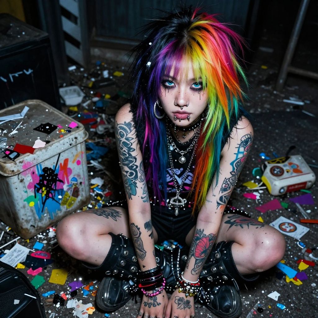 1girl, Photo realistic, hyper detail, hyper realistic, in a punk style, piercings, tatoos, trash, garbages, color paint splats, coloured spoils, dust and scratches, punk crete, rainbow coloured hairs, synthwave, dark mood lighting
