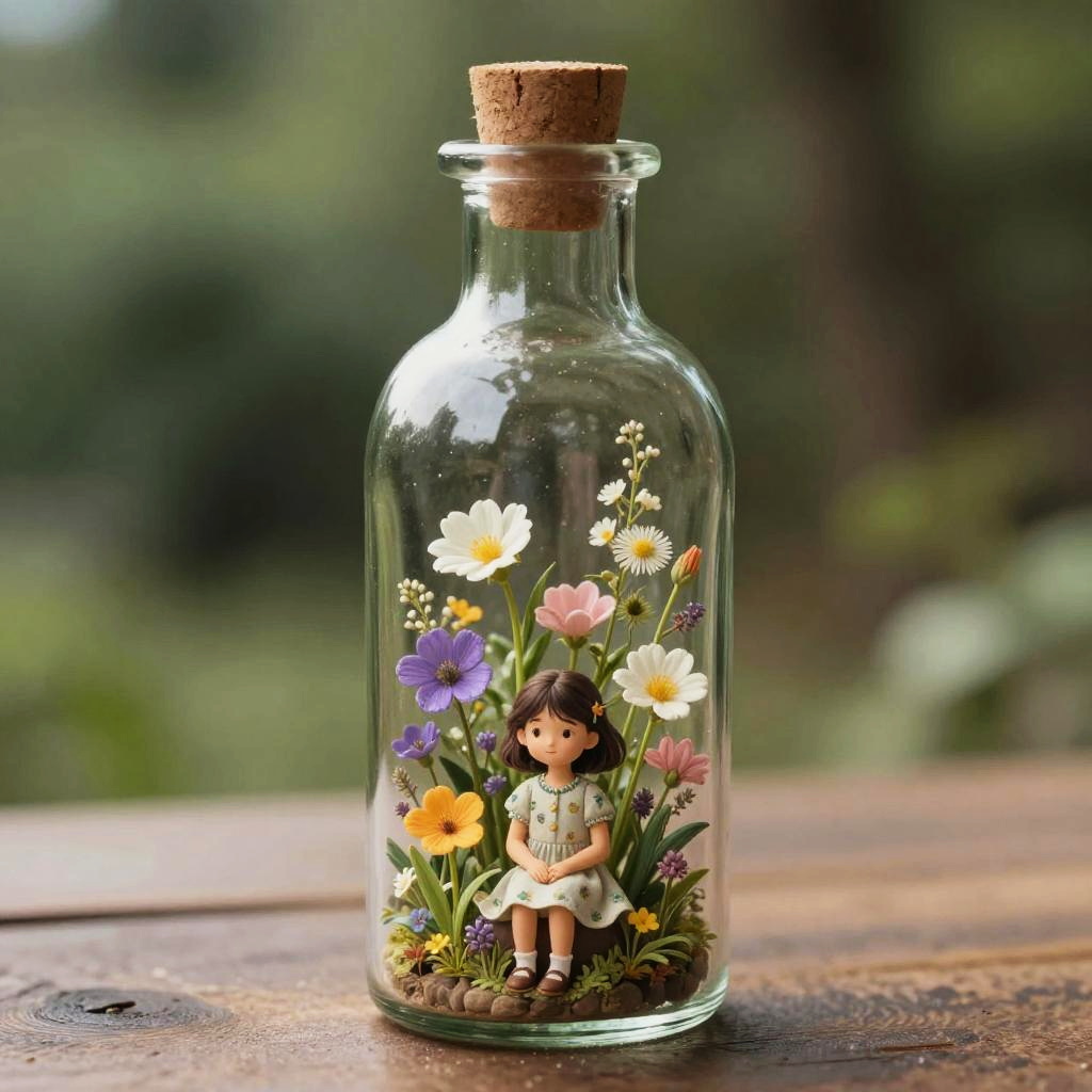 (a little girl), charming, bottle, in glass bottle, nature, flowers, masterpiece, best quality, high realistic, (masterpiece, best quality:1.5)