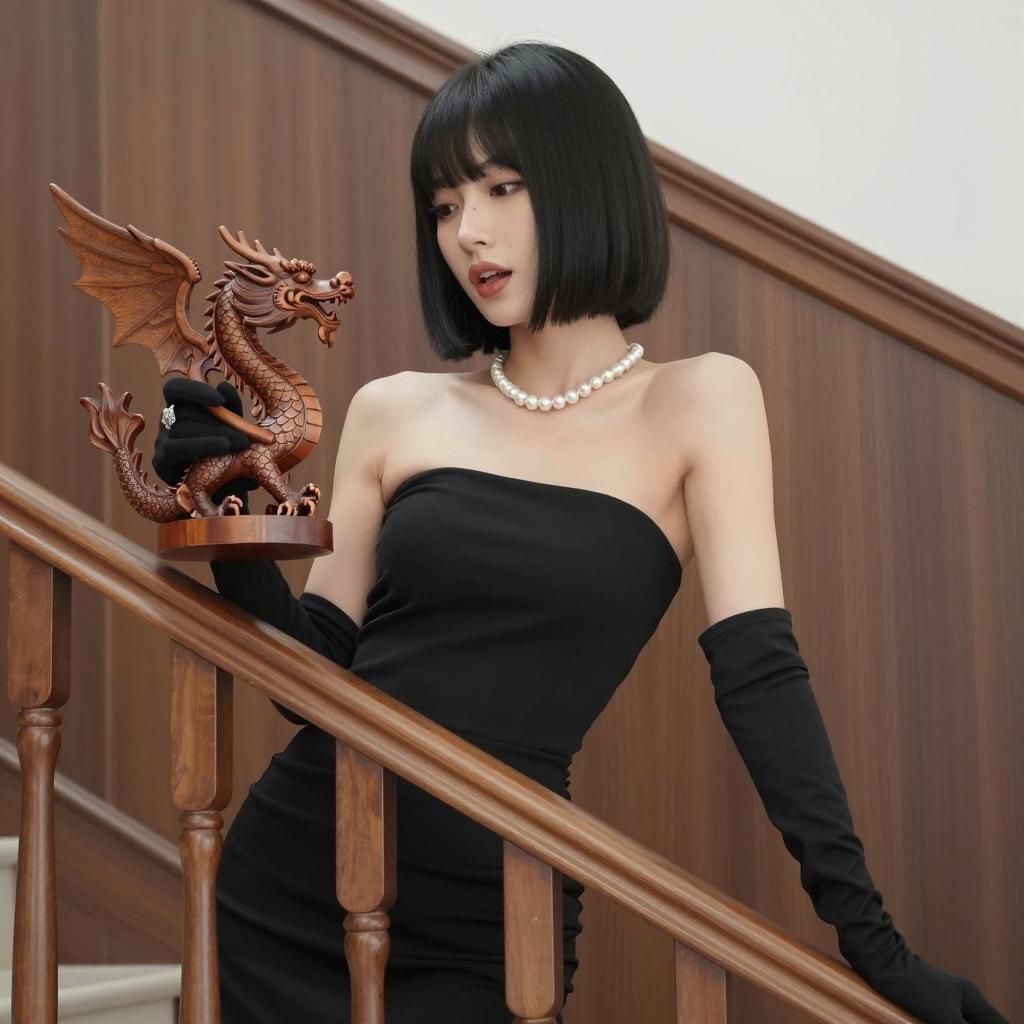 A young woman with a black bob haircut wearing a strapless black dress, black gloves, and a pearl necklace stands on a wooden staircase. She holds a detailed wooden dragon statue with scales and wings in one hand, while her other hand rests on the railing. The background features wooden paneling. The woman has a slightly surprised expression and wears a ring on her left hand.
