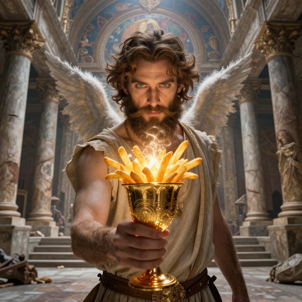 Majestic shot of a bearded man grasping a radiant golden chalice overflowing with ethereal, luminescent French fries, bathed in an otherworldly glow, amidst an angelic aura, set against an imposing backdrop of ancient, crumbling structures, weathered stone columns, and ornate frescoes, dramatic lighting casting long Man has masculine face and piercing eyes