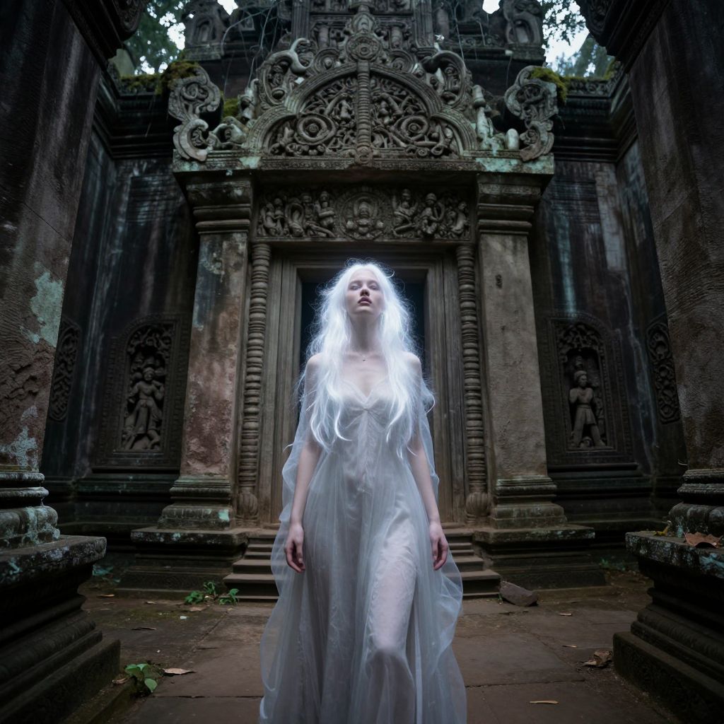 Photograph of a pale, ethereal woman with long white hair, wearing a translucent white dress, standing in a dark, ancient stone temple with intricate