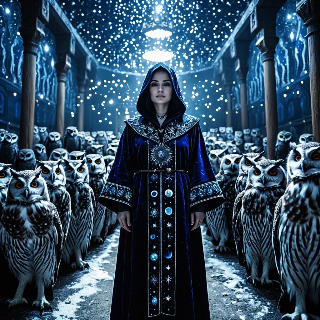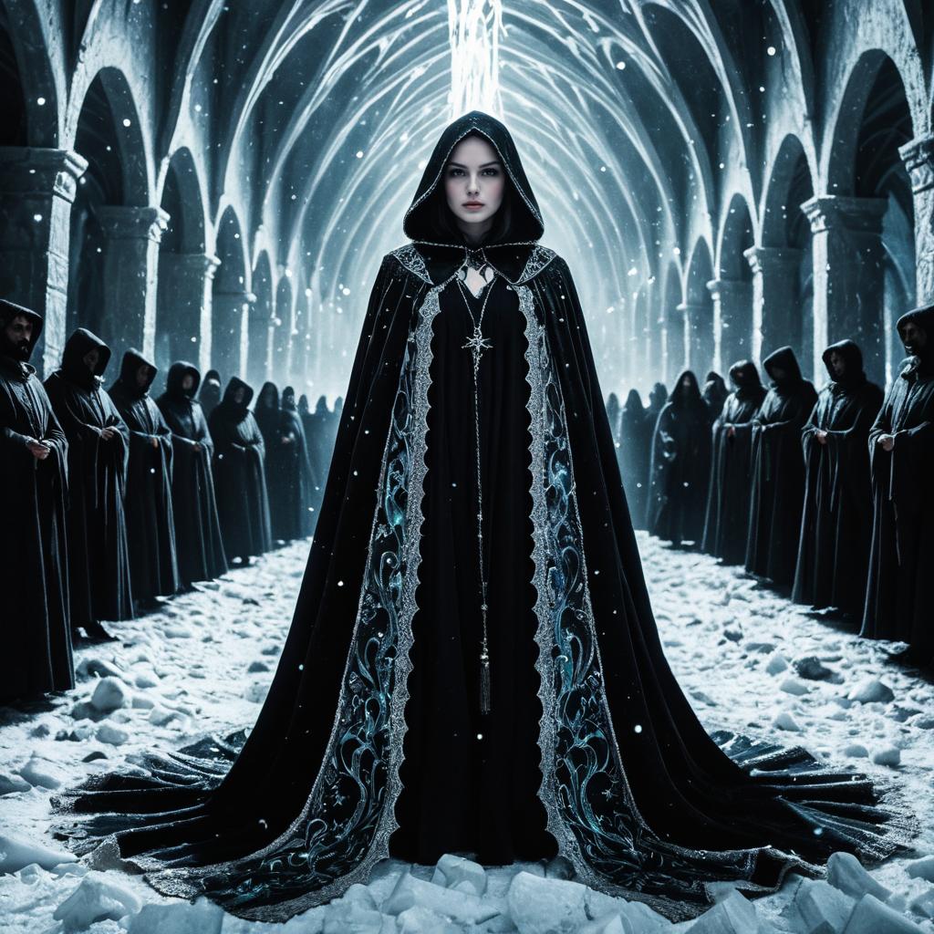A mystic woman stands at the center of a grand gothic hall wearing a lace-trimmed, iridescent onyx black cloak with an elaborate design. She is surrounded by a crowd of hooded, gloomy specters aligned along the cathedral-like arches of the room. The floor is covered in snow or ice, with sparks flying in the air and dramatic cinematic lighting emphasizing the mystical atmosphere.