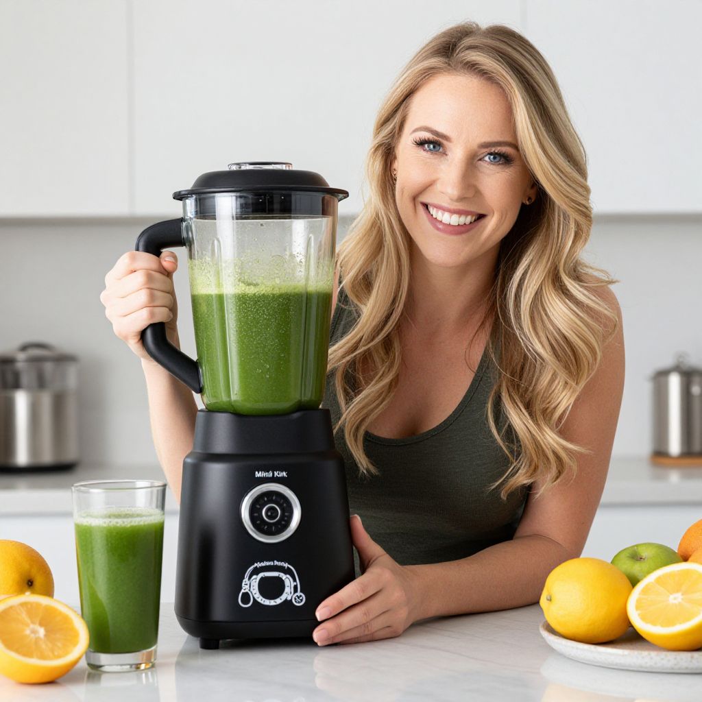 Blonde-haired woman Mimi Kirk, author of *The Ultimate Book of Modern Juicing*, smiles as she holds a sleek black blender filled with vibrant green juice, while a matching glass and fresh fruits rest on the countertop beside her.