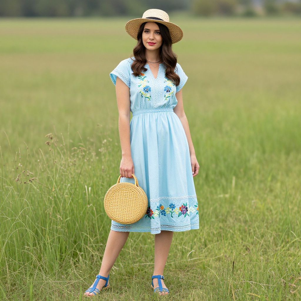 Woman standing in a vibrant meadow wearing a light blue embroidered dress featuring floral patterns, paired with a straw hat and matching round bag, complemented by blue jelly sandals, embodying a chic and retro summer style.