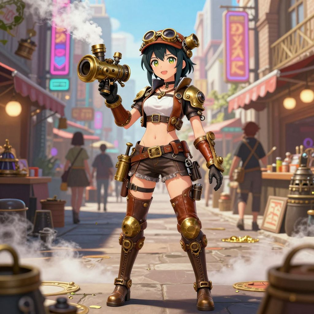 Full-body shot of an anime steampunk girl in a bustling market street, wearing layered leather and brass attire, holding a steam-powered gadget, vibrant cityscape with steam vents and neon signs, intricate mechanical details, expressive eyes reflecting adventure.