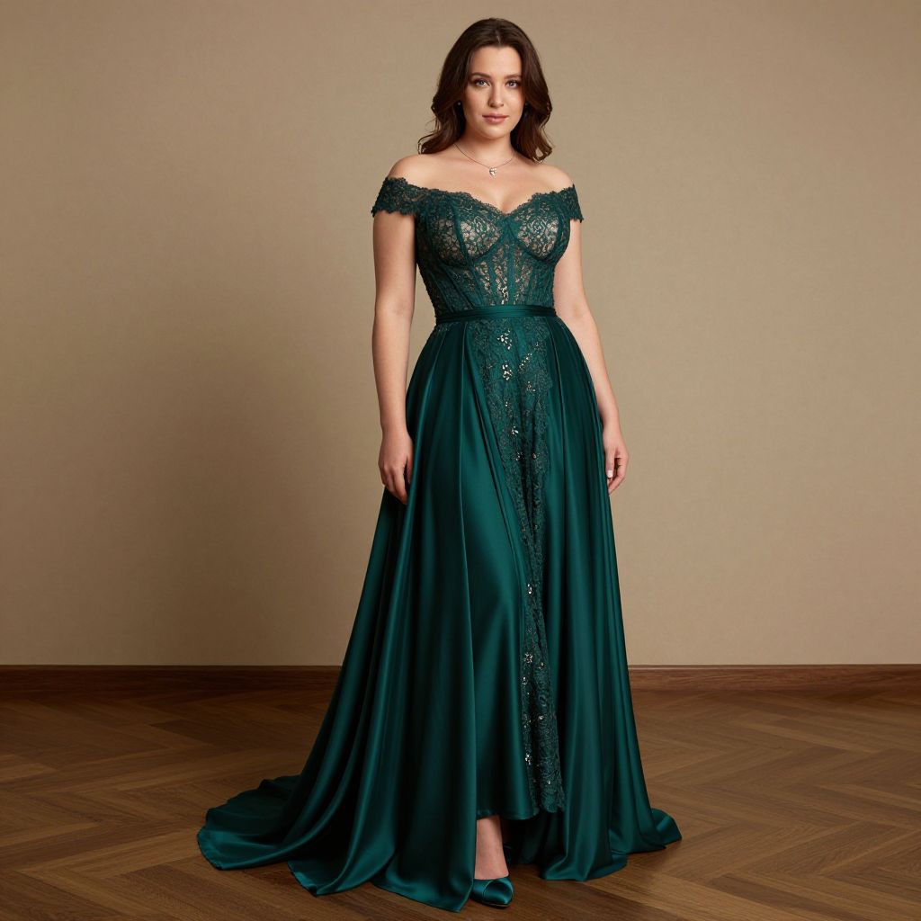 Full body shot, lanky woman, elegant couture formal empire waist dress, flowing silk fabric, deep emerald green, intricate lace overlay, off-the-shoulder neckline, delicate cap sleeves, cinched waist, cascading floor-length skirt, subtle train, embellished with hand-sewn crystals, matching satin heels, minimalist silver jewelry, soft waves in hair, natural makeup, poised posture, luxurious setting Sexy. Pretty face and beаutiful eyes. Big breasts