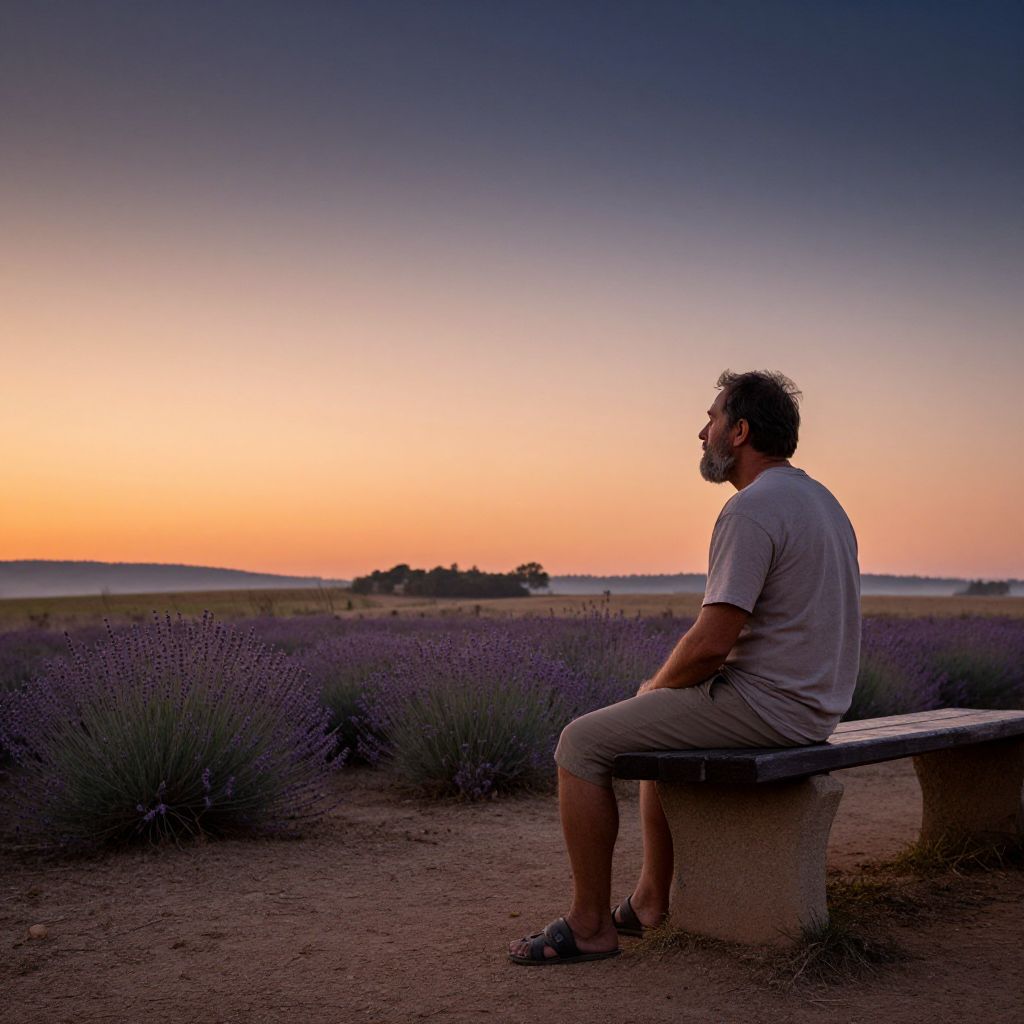 Photograph of a bearded man with short dark hair, wearing a light grey t-shirt and khaki shorts, sitting on a concrete bench in a lavender field at sunset. He faces right, gazing at the horizon. The sky transitions from deep blue at the top to warm orange near the horizon. Purple lavender bushes surround the bench, with dry, sandy ground beneath. The distant landscape shows rolling hills and a dark tree line. The image has a serene, contemplative atmosphere with soft, warm lighting.