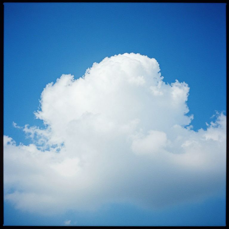 Photograph of a clear blue sky with three fluffy white clouds, illuminated by sunlight, creating soft, glowing edges.