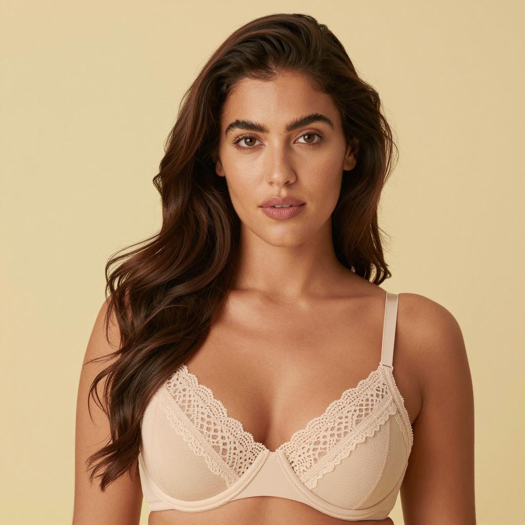Woman in Beige Lace Bra with Wavy Hair
