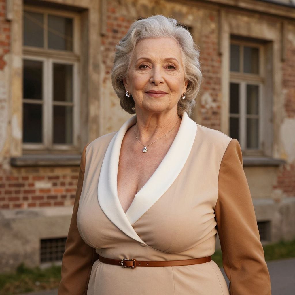An elderly woman with grey hair, wearing a stylish beige and brown outfit featuring a soft white collar and a delicate brown belt, exuding elegance and charm. She has a prominent, full figure with big tits and a sexy, confident presence, adorned with a delicate necklace around her neck and shimmering earrings in her ears. Her expression is warm and serene, with a gentle smile that radiates warmth. The background features a classic, weathered building with tall windows and a faded brick façade, adding a sense of timeless charm and quiet nostalgia. The lighting is soft and golden, casting a cozy, inviting atmosphere.