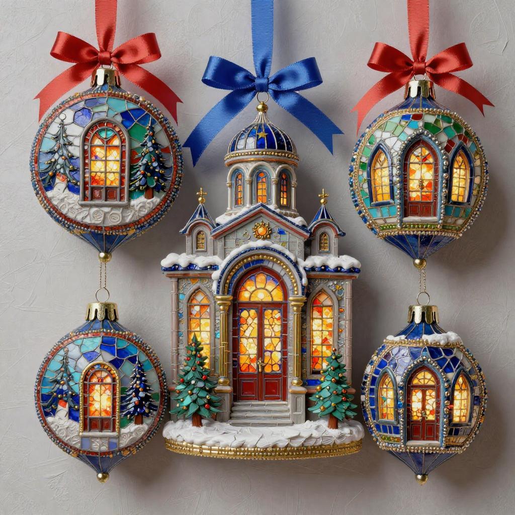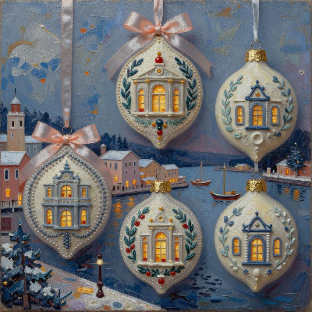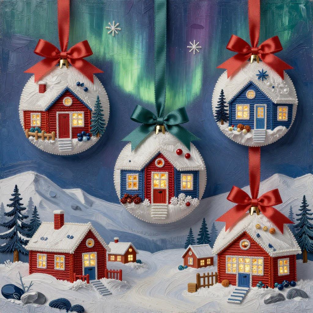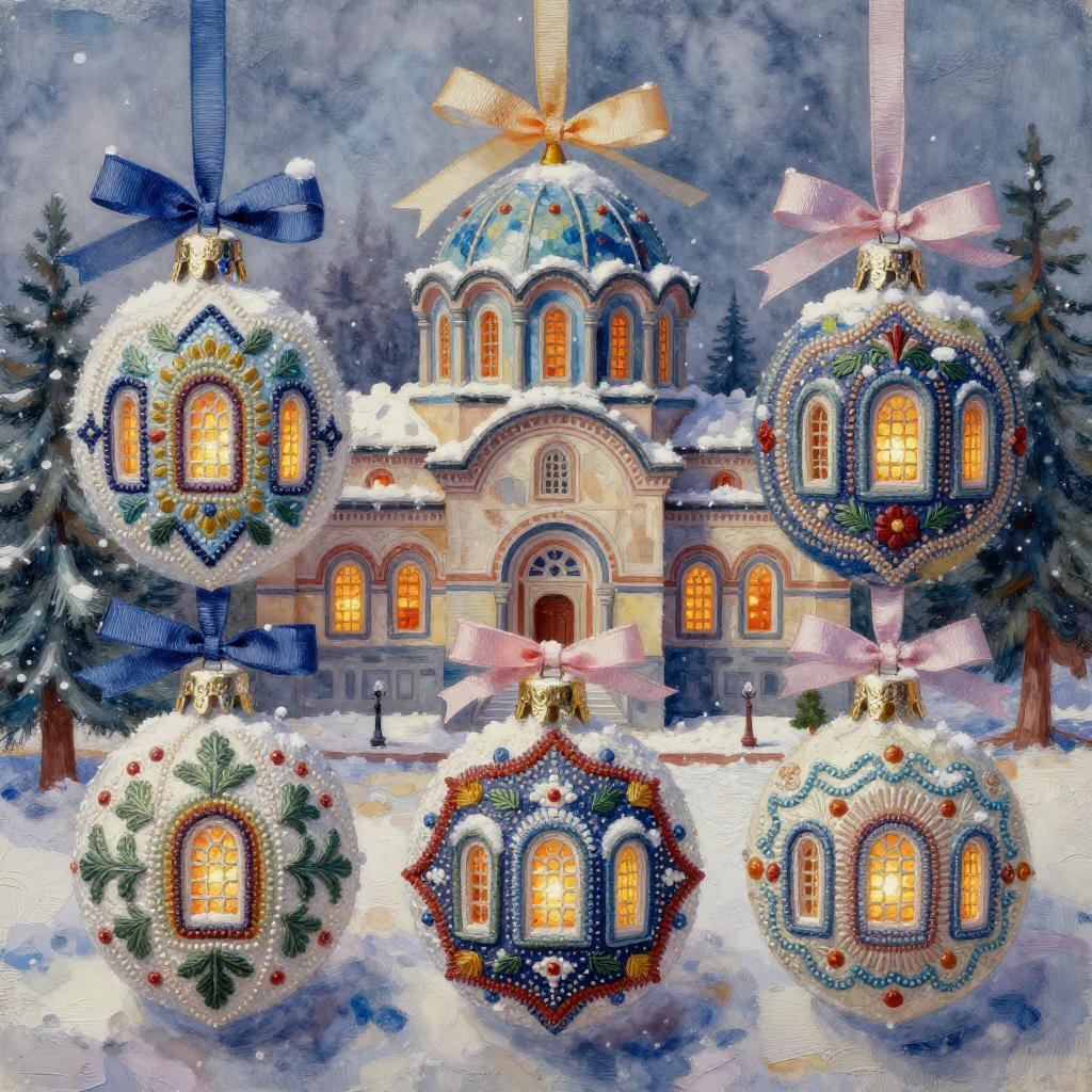 3d soft vivid winter ornaments, Brutalist, constructivist glitch art, diorama, Mid-century Eastern European holiday market, warm lights in the windows, extremely volumetric, silk ribbons embroidery, beadwork, intricately textured, in the style of heavy impasto texture, gorgeous best-ever masterpiece, volumetric