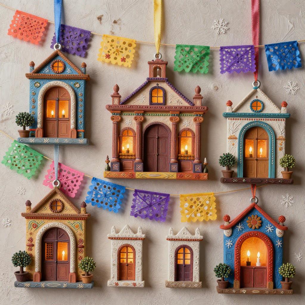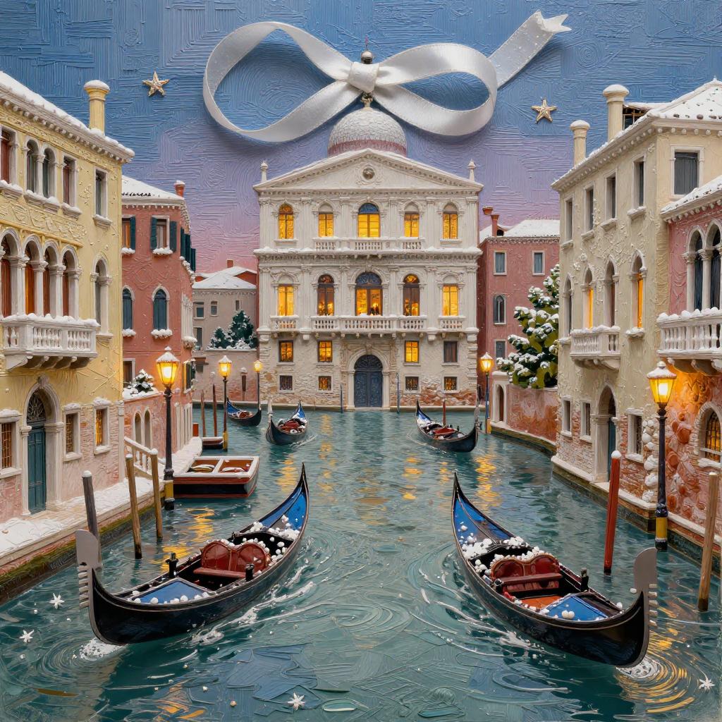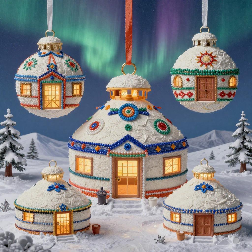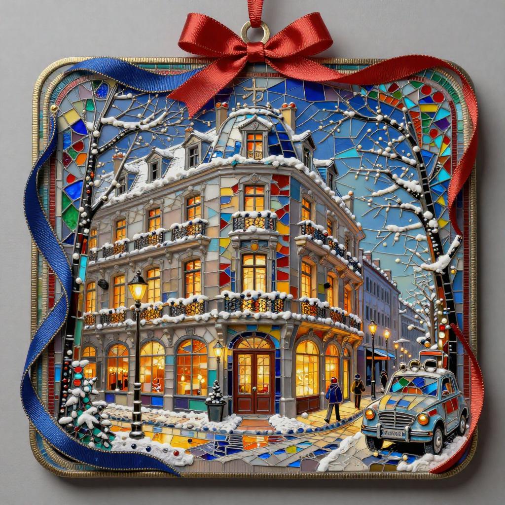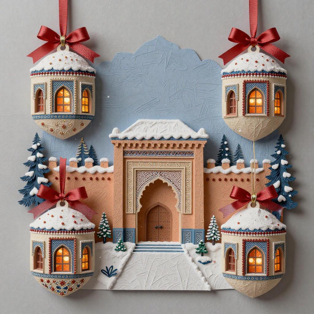 3d soft vivid winter ornaments, Brutalist, constructivist glitch art, diorama, Mid-century Eastern European holiday market, warm lights in the windows, extremely volumetric, silk ribbons embroidery, beadwork, intricately textured, in the style of heavy impasto texture, gorgeous best-ever masterpiece, volumetric