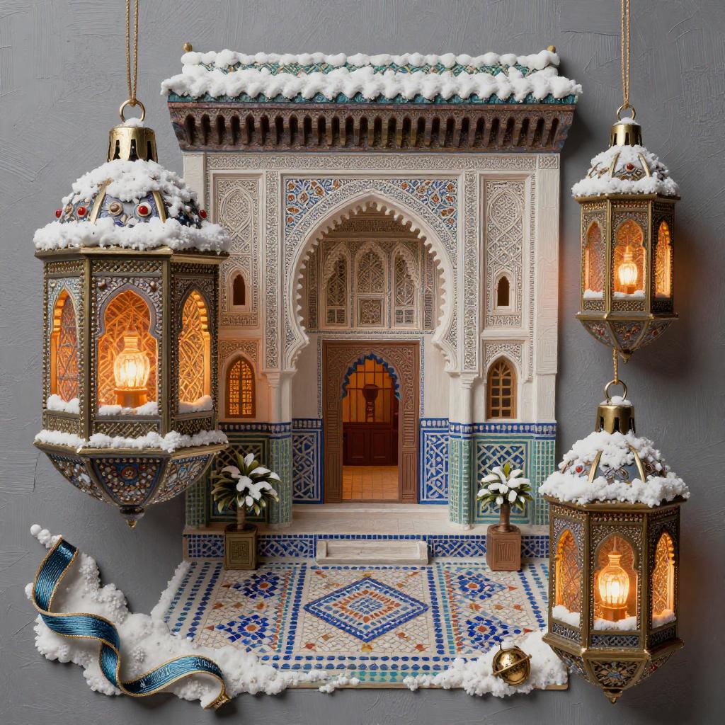 A 3D diorama depicting a vivid and intricately textured Mid-century Eastern European holiday market scene. The market features warm, volumetric lighting in window displays decorated with embroidered silk ribbons, beadwork, and festive ornaments. Snow-covered miniature Christmas trees and traditional holiday decorations create a cozy winter atmosphere with a blend of brutalist and constructivist glitch art styles.