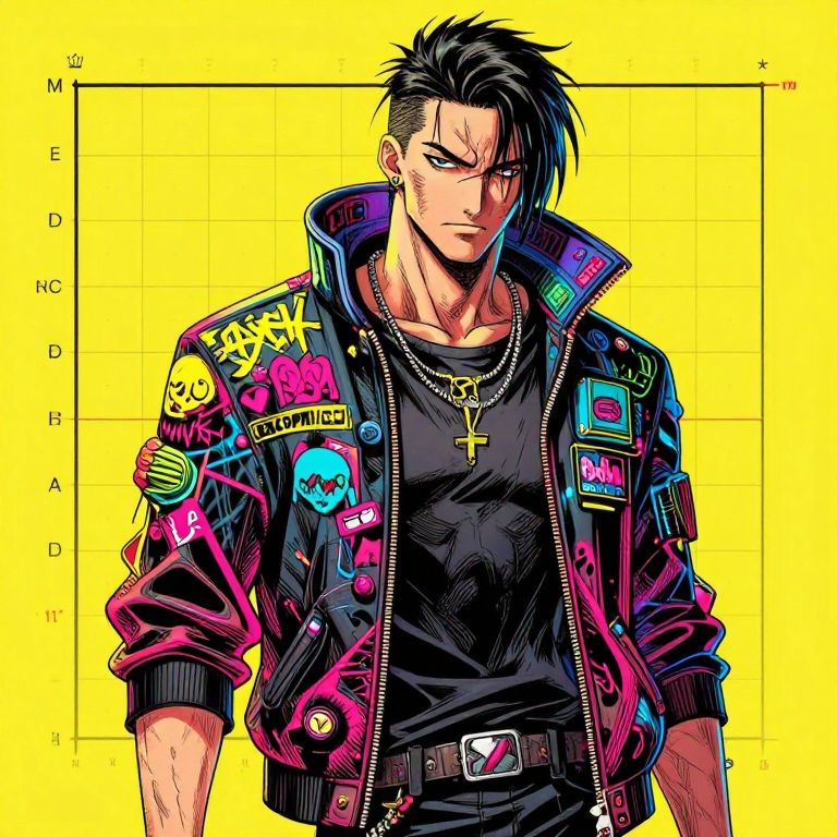 A cyberpunk-themed manga character with neon colors, intricate inking, and graffiti art elements, set against a golden ratio composition background.