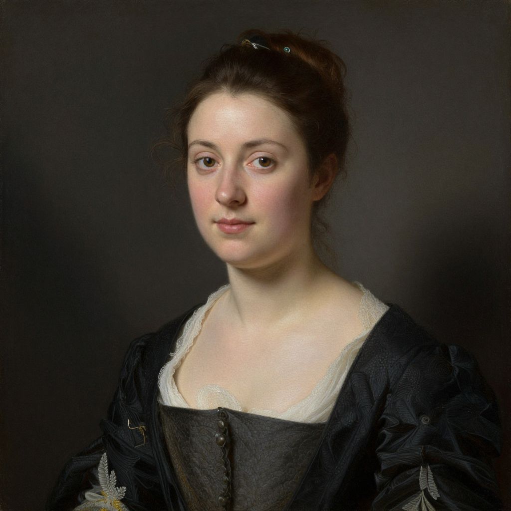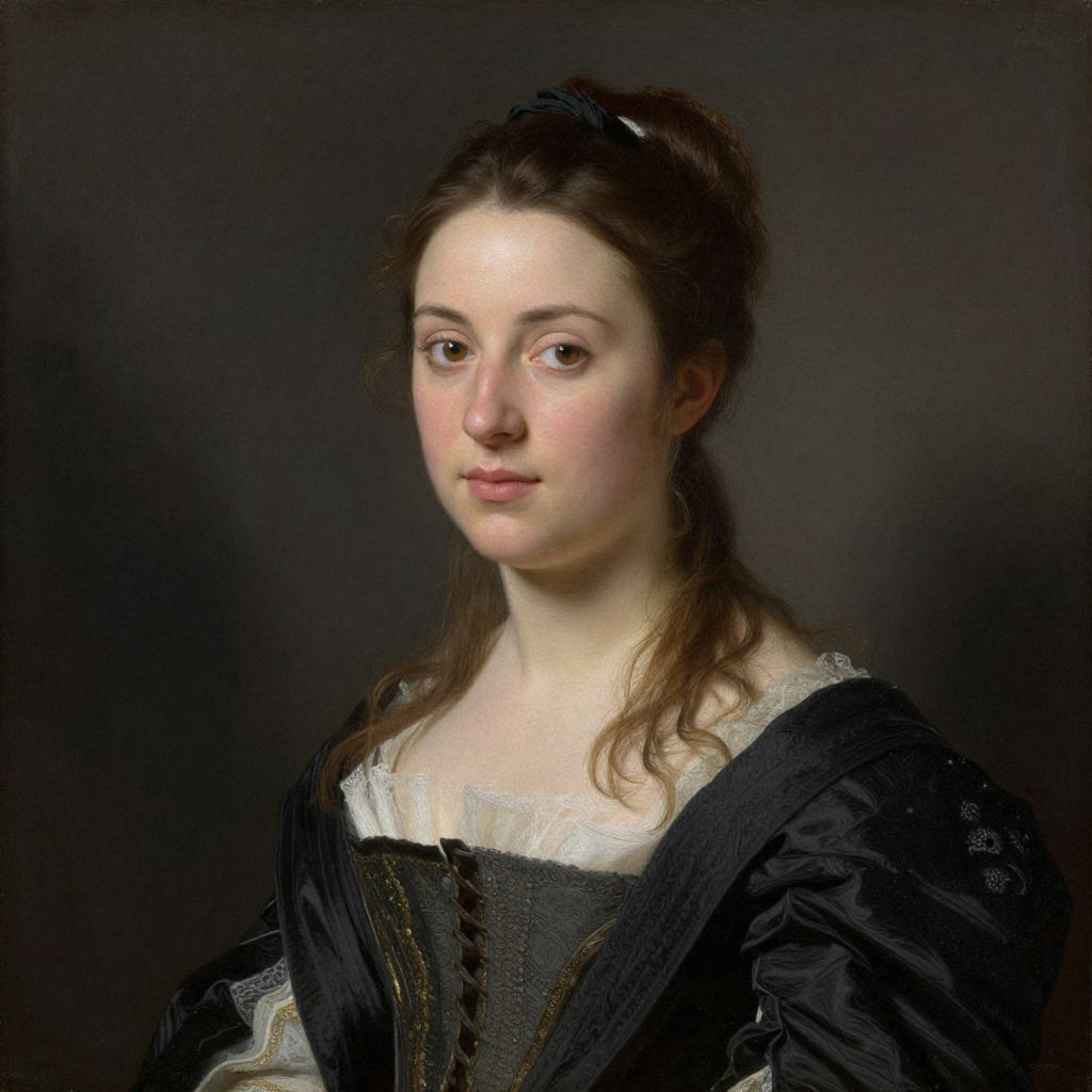 This is a classical oil painting portrait of a young woman with fair skin and brown hair, styled in a loose, low ponytail. She has a soft, composed expression and light brown eyes. She wears a black, slightly textured dress with a white lace collar and a square neckline. The dark background contrasts with her pale complexion, highlighting her face and upper body. The painting style is realistic, with delicate brushstrokes and a focus on natural light and shadow. The overall mood is serene and dignified.