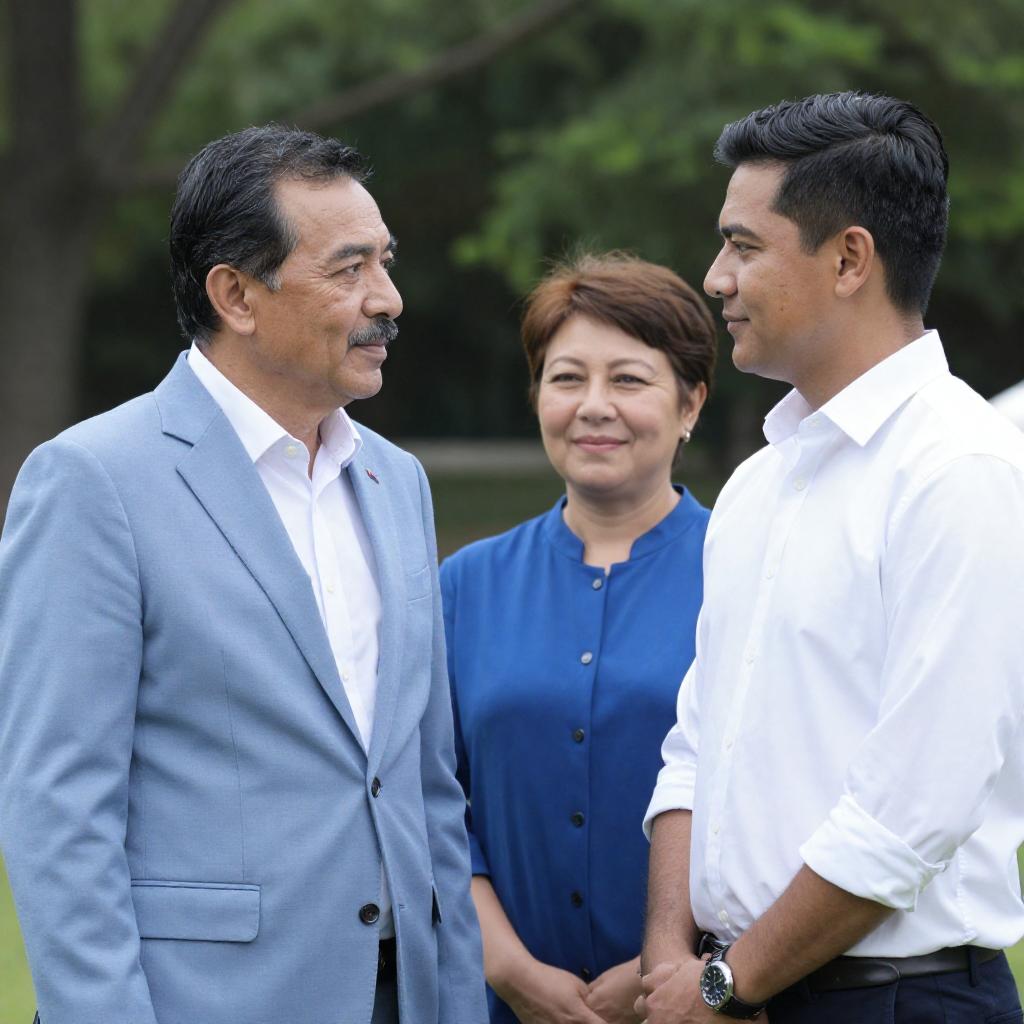Photograph of two men in black suits with white shirts and ties, waving to the crowd. They are surrounded by a dense cluster of red, white, and blue balloons. Musicians in white uniforms play in the background. The men are smiling, and the scene is lively and celebratory.