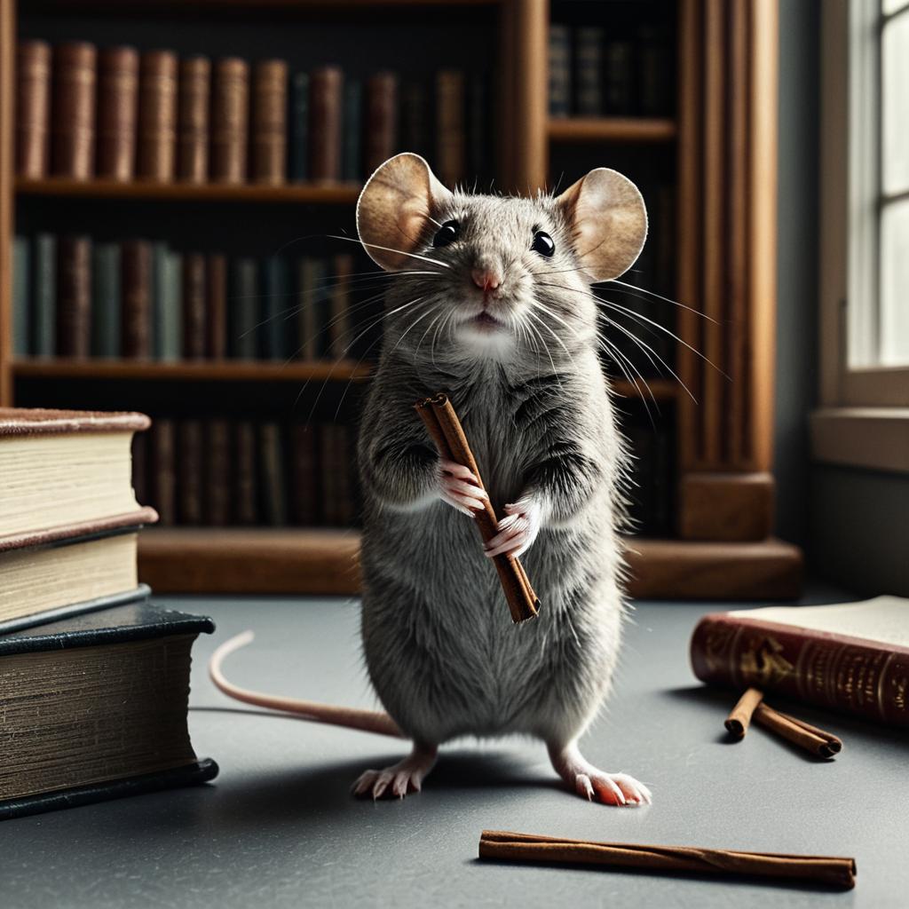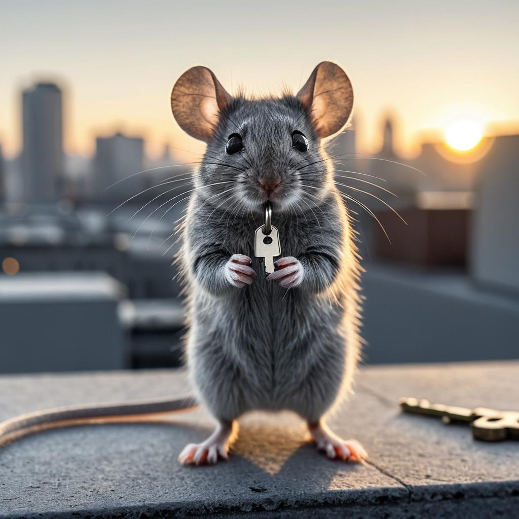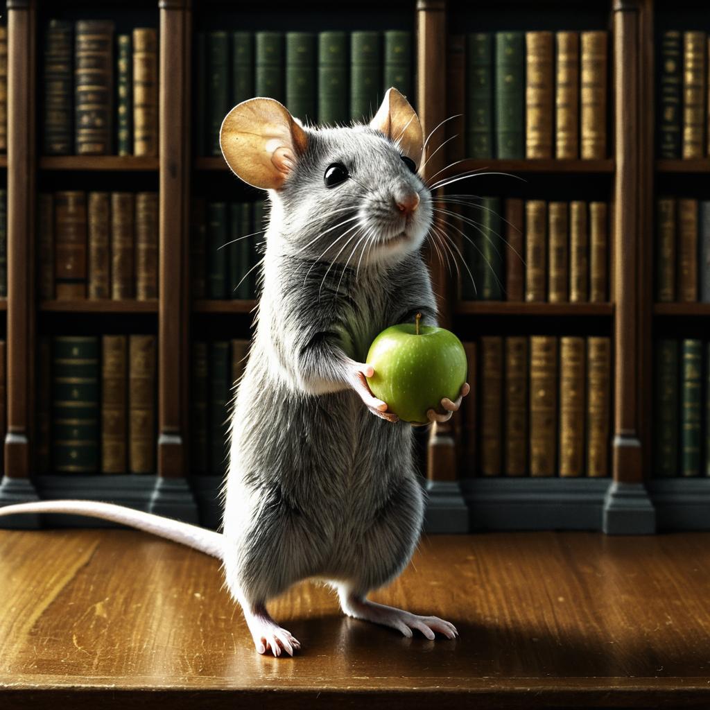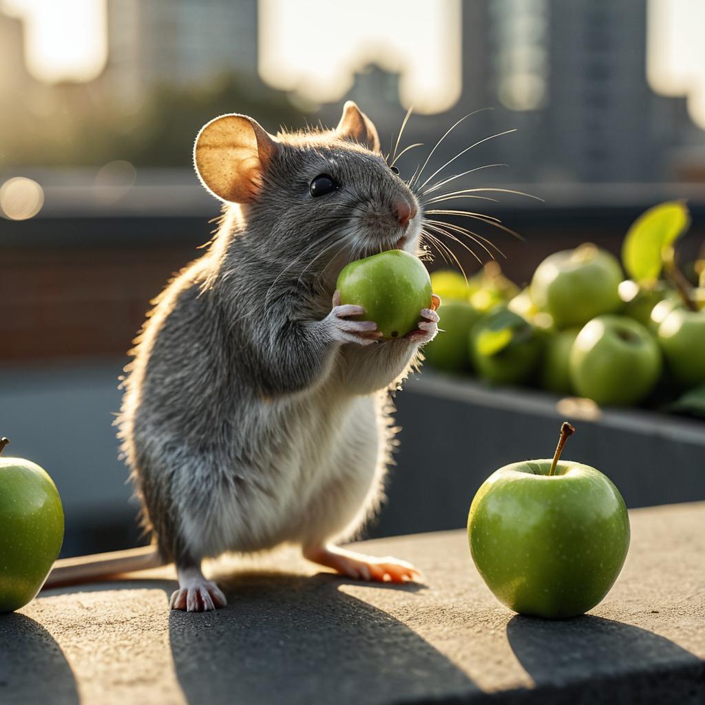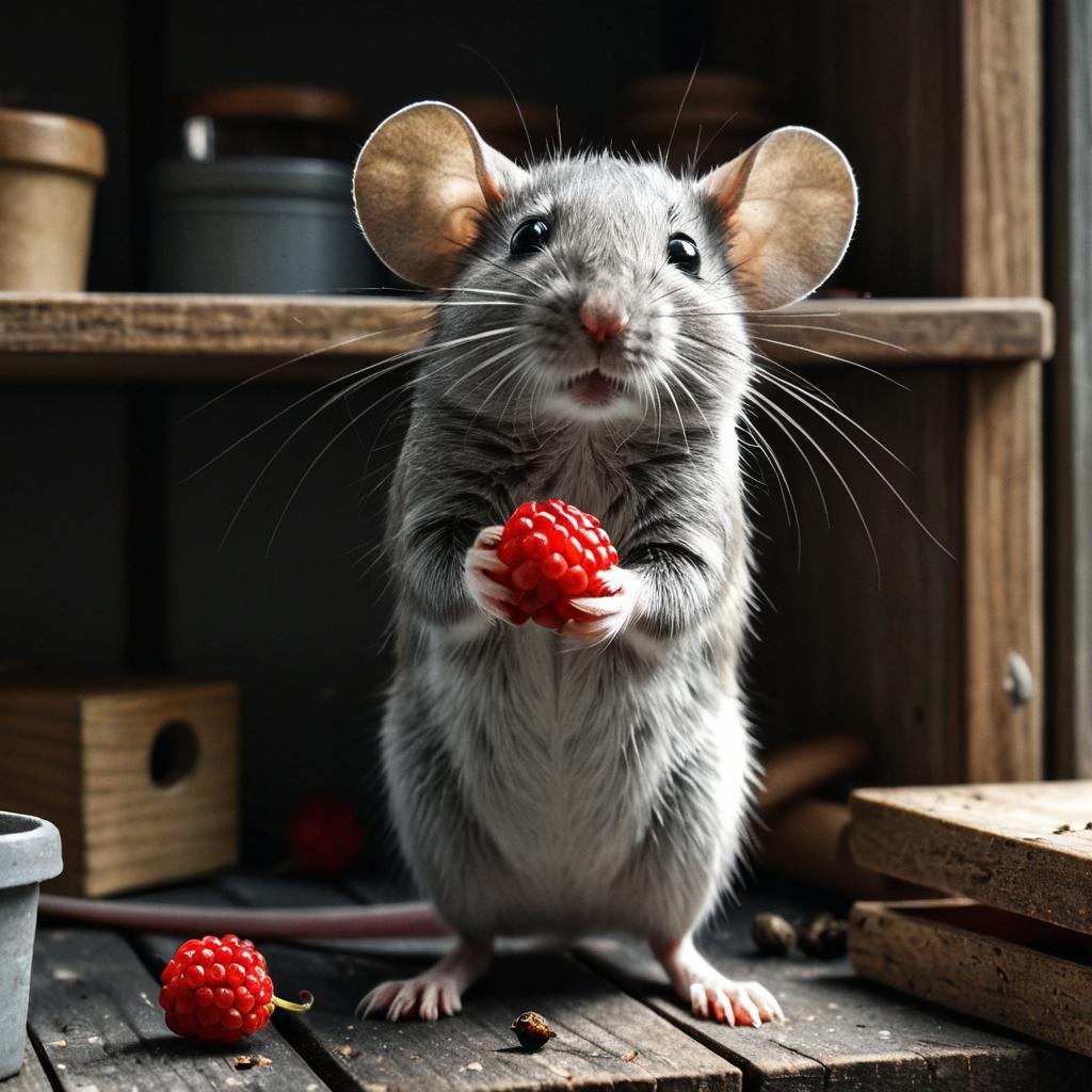 A hyper-detailed photorealistic scene of a small grey mouse standing on its hind legs in sunlit greenhouse with lush green plants, holding tiny red cherry tomato, rendered in soft diffused natural light with gentle shadows, simple grey background, crisp whiskers, glossy black eyes, realistic textures.