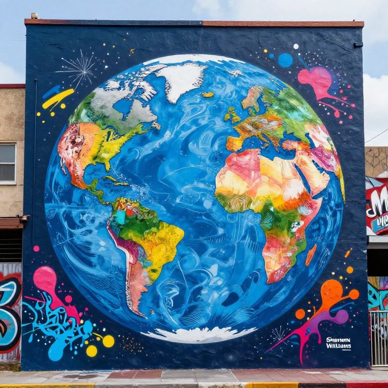 Cover the Earth Sherwin Williams street art mural, vibrant splash of paints covering a huge earth map, intricate details of continents filled with bright Sherwin Williams color swatches, urban setting with graffiti influences, bold and contemporary style