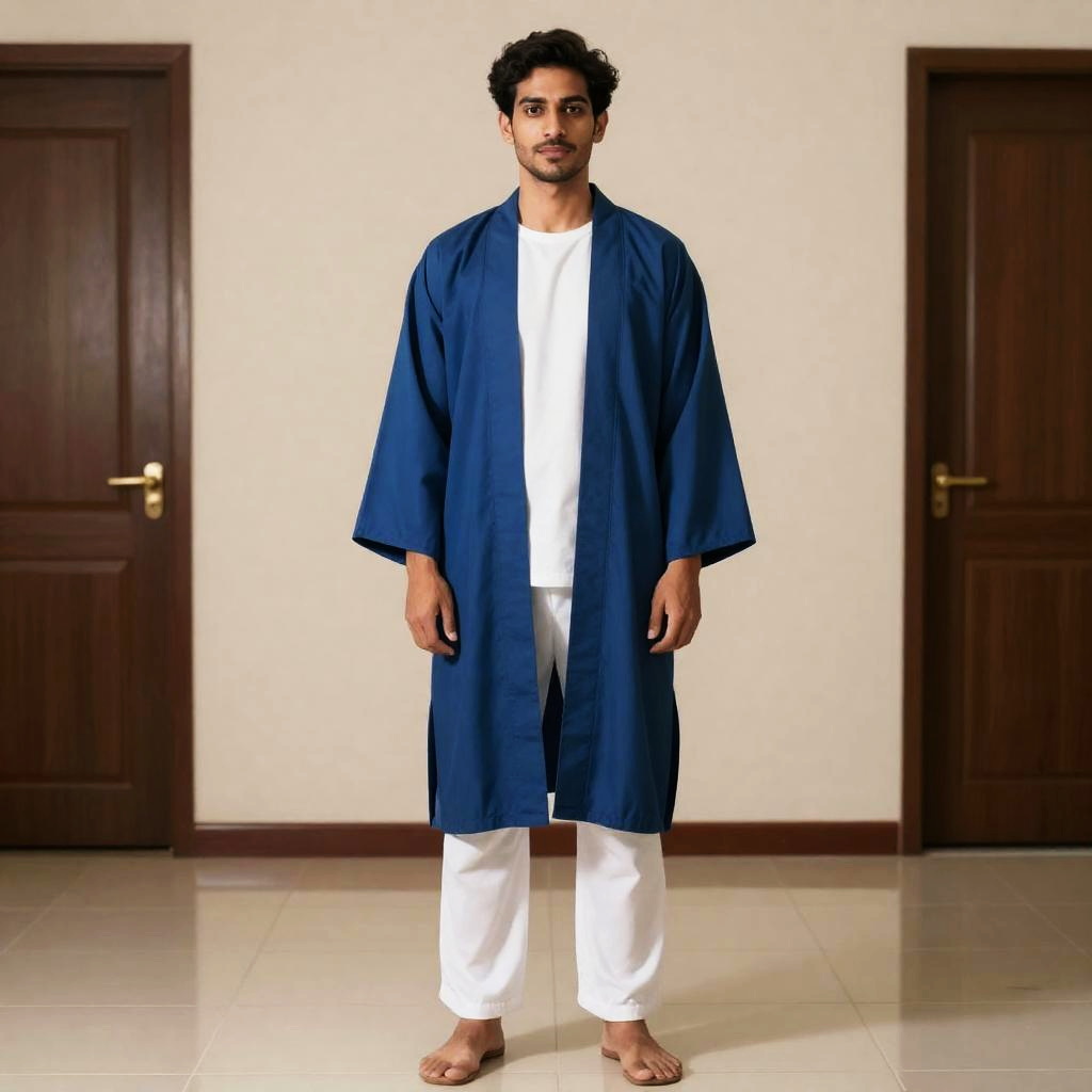 Man Optional Attire Costume, man in a blue robe and white pants standing in a room