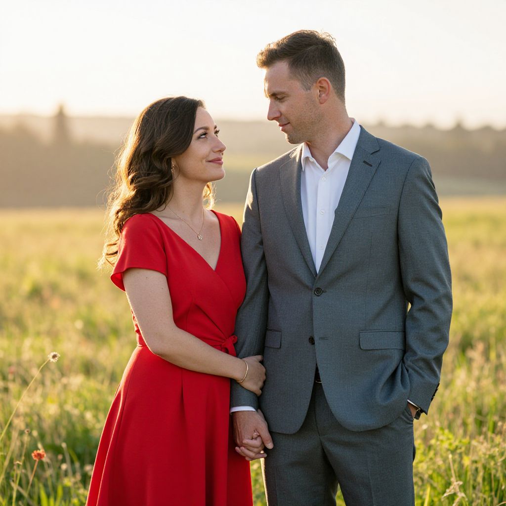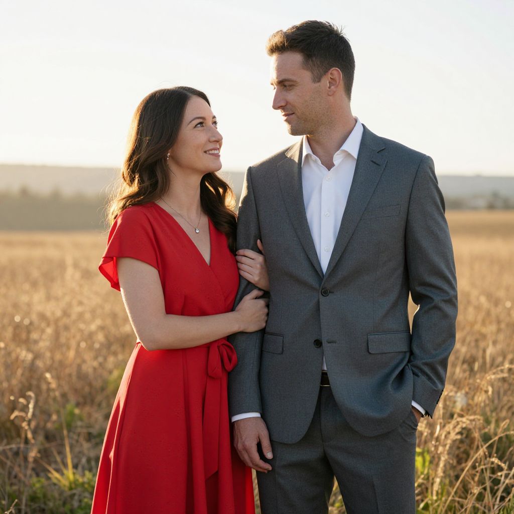 Photograph of a couple standing in a sunlit grassy field. The woman, with long, wavy brown hair and fair skin, wears a vibrant red, short-sleeved dress and a delicate gold necklace. She looks up at the man with a gentle smile. The man, with short brown hair and fair skin, wears a gray suit with a white shirt, looking down at her with a soft smile. They hold hands, with her left hand resting on his right arm. The background is a blurred, golden-hued field with tall grass, and the sun is setting, casting a warm glow.