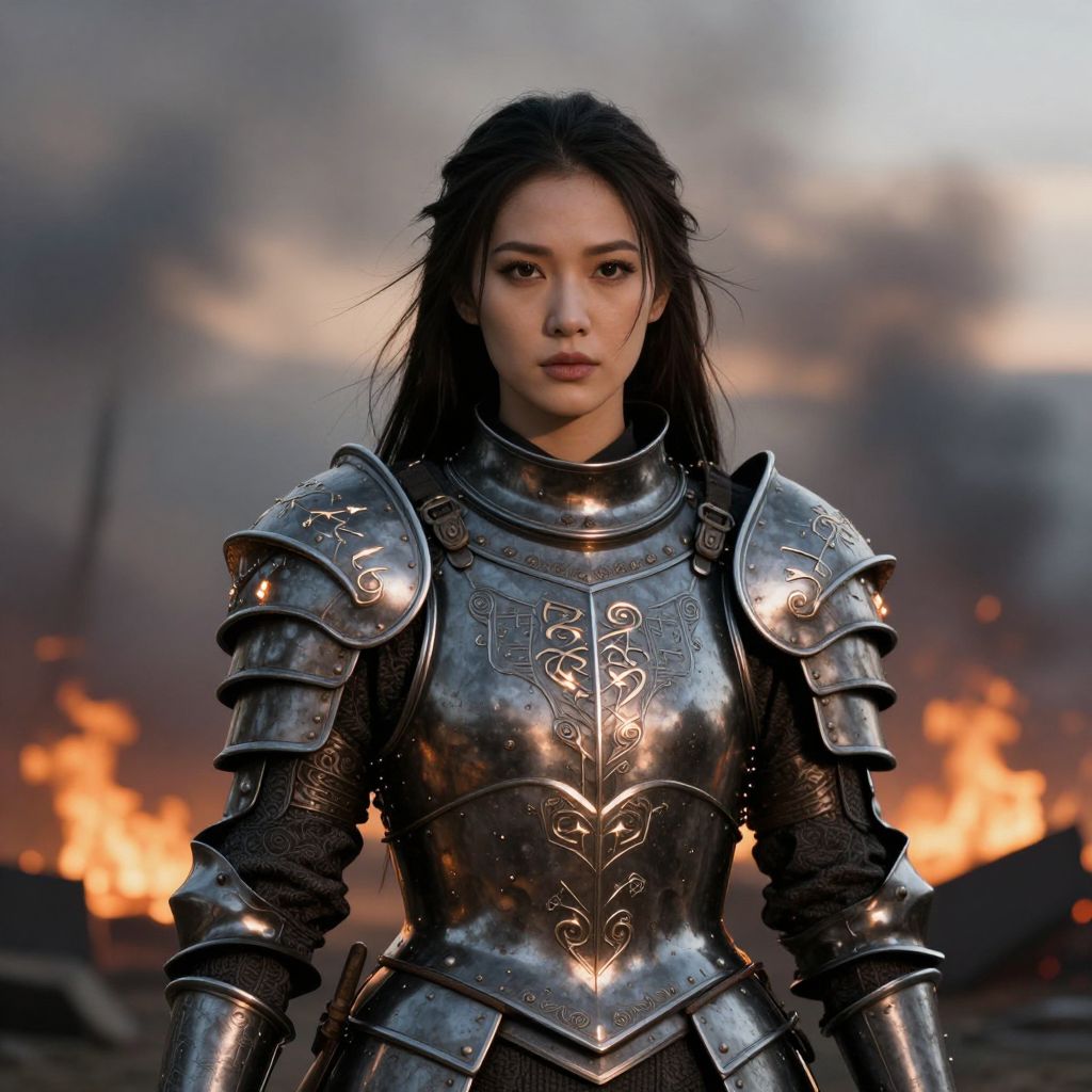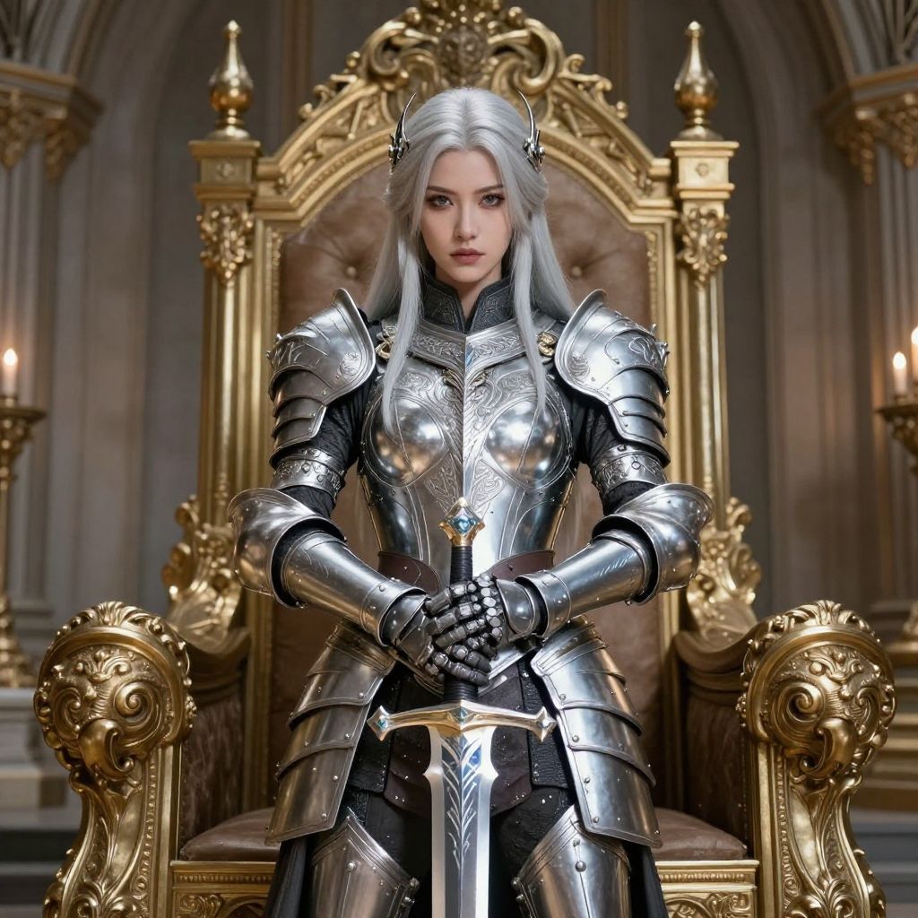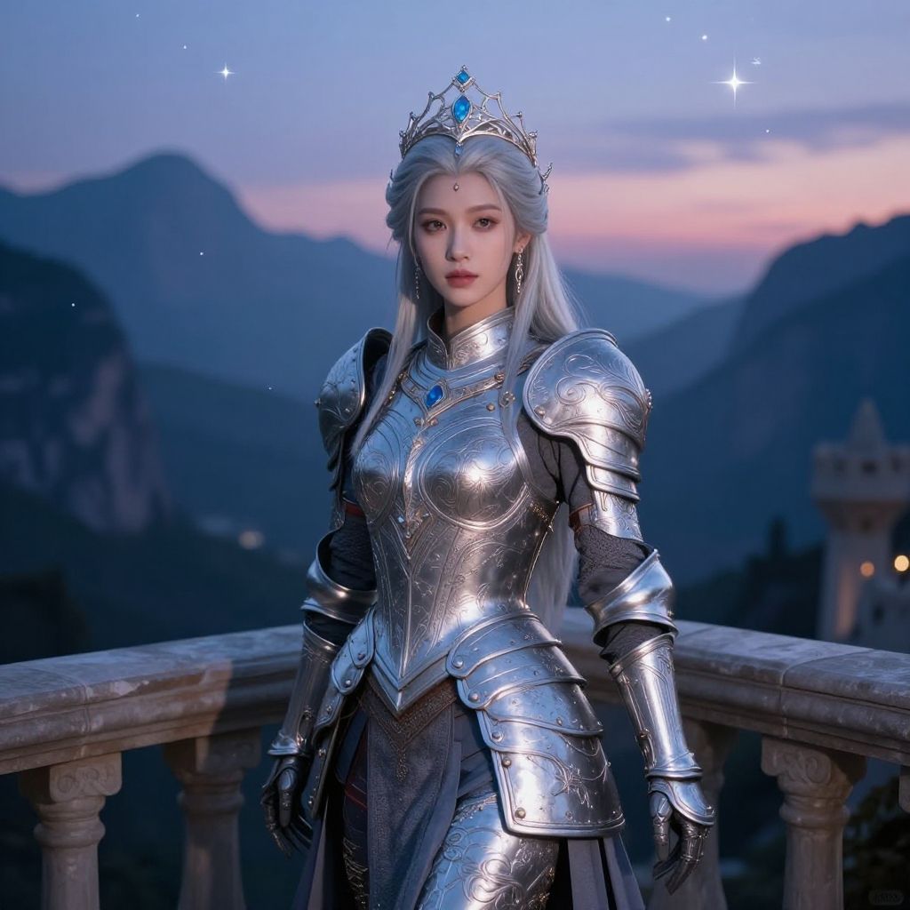 A high-fashion Face CloseUp of a shyly laughing White ciri with fair skin and delicate freckles, She wears an elaborate, futuristic armor inspired by the Japanese Edo period and Warhammer aesthetics, Her bright blue eyes peek out beneath an oversized kabuto-style helmet, The armor is crafted from an intensely reflective, mirror-like silver material, so polished that it catches and mirrors everything around her, creating an almost blinding effect with every movement, The helmet gleams with a flawless shine, its dragon-like crest reflecting the light in striking patterns Like the chainsword SHe holds, The armor’s silver plates are highly reflective, amplifying the surroundings as they curve around her body, making her appear as though she's wearing pure, polished glass that constantly shifts with light and shadow, Behind her, a translucent cape flows in the wind, glowing with soft, rainbow-like colors that shimmer and change, The ethereal, prismatic hues dance as the cape moves, adding a magical, surreal quality to her powerful yet approachable presence, The contrast between the brilliant silver of her armor and the softly glowing cape gives her an otherworldly, almost celestial appearance, Set against a simple light gray background, the bright reflections of the armor and the glowing colors of the cape create a captivating balance, allowing her mighty sword to shine through amidst the dazzling display of light and color