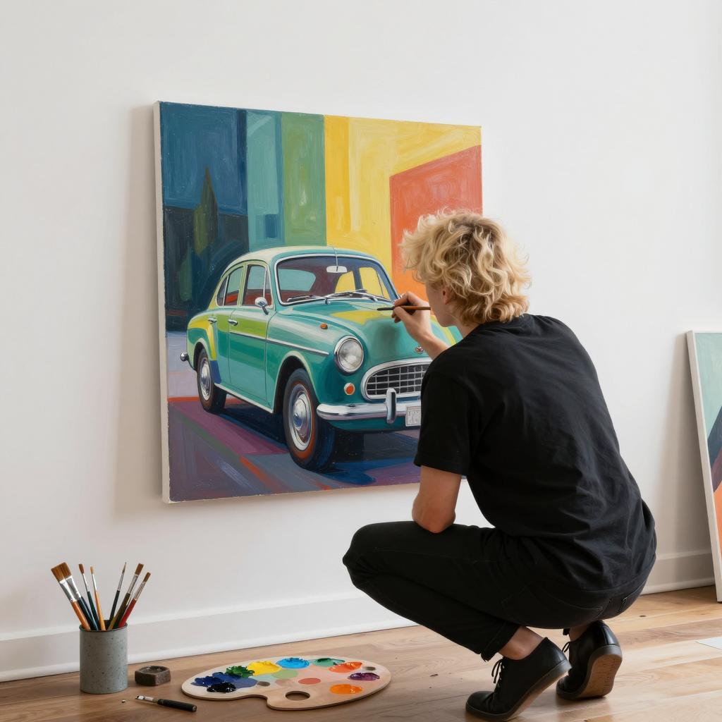 Artist with blonde hair, wearing black clothes, crouching in front of a colorful, abstract painting of retro cars. Paints, brushes, and a palette on a wooden table in the foreground. White wall background. Painting leans against the wall. Artist facing away.