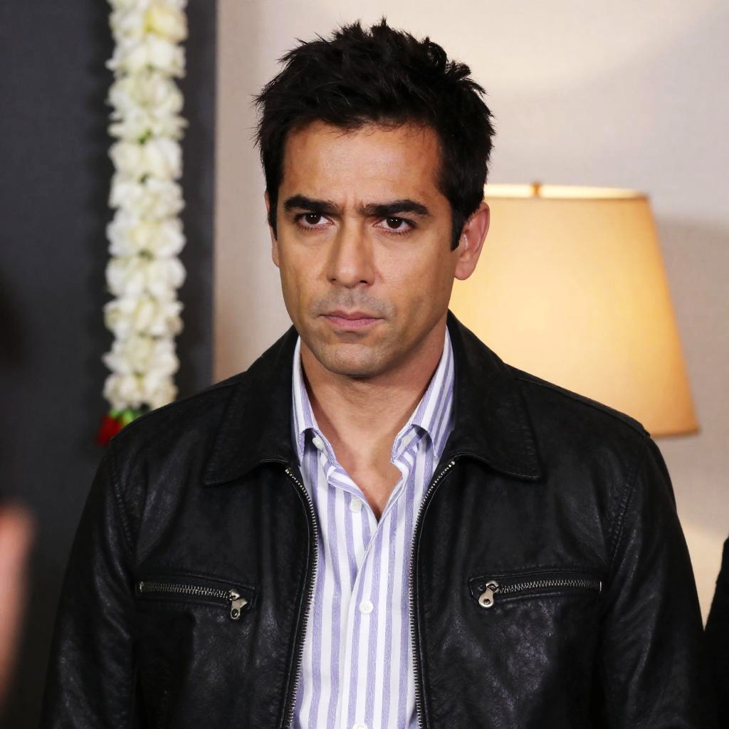 Photograph of a man with short dark hair, intense expression, wearing a black leather jacket over a white and purple striped shirt. Background includes white flower garland, orange lamp, and partially visible person in the foreground. Indoor setting.
