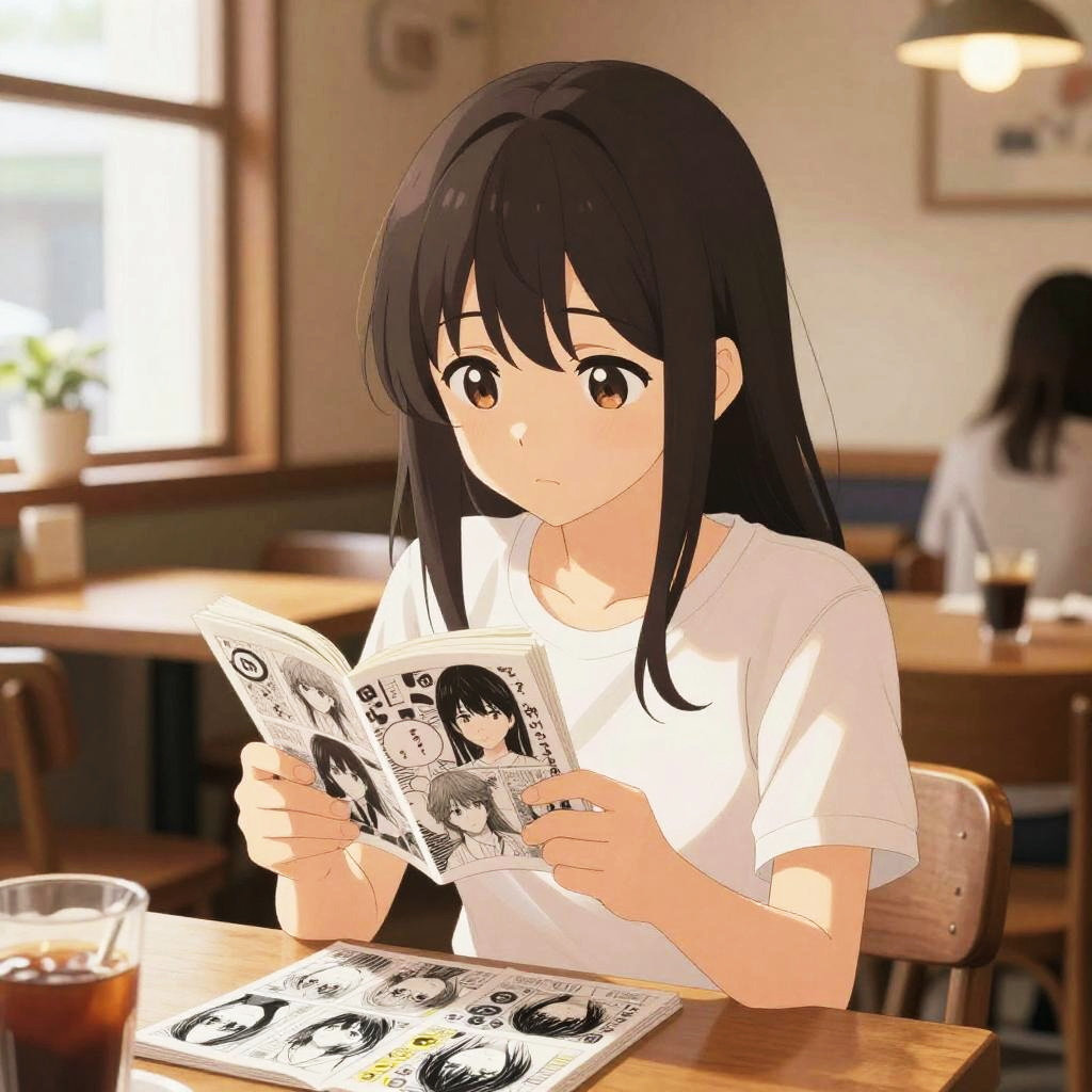 Cute Japanese teen enjoying manga at a cozy cafe, warm interior with wooden furniture, soft sunlight through windows, relaxed atmosphere, detailed character design
