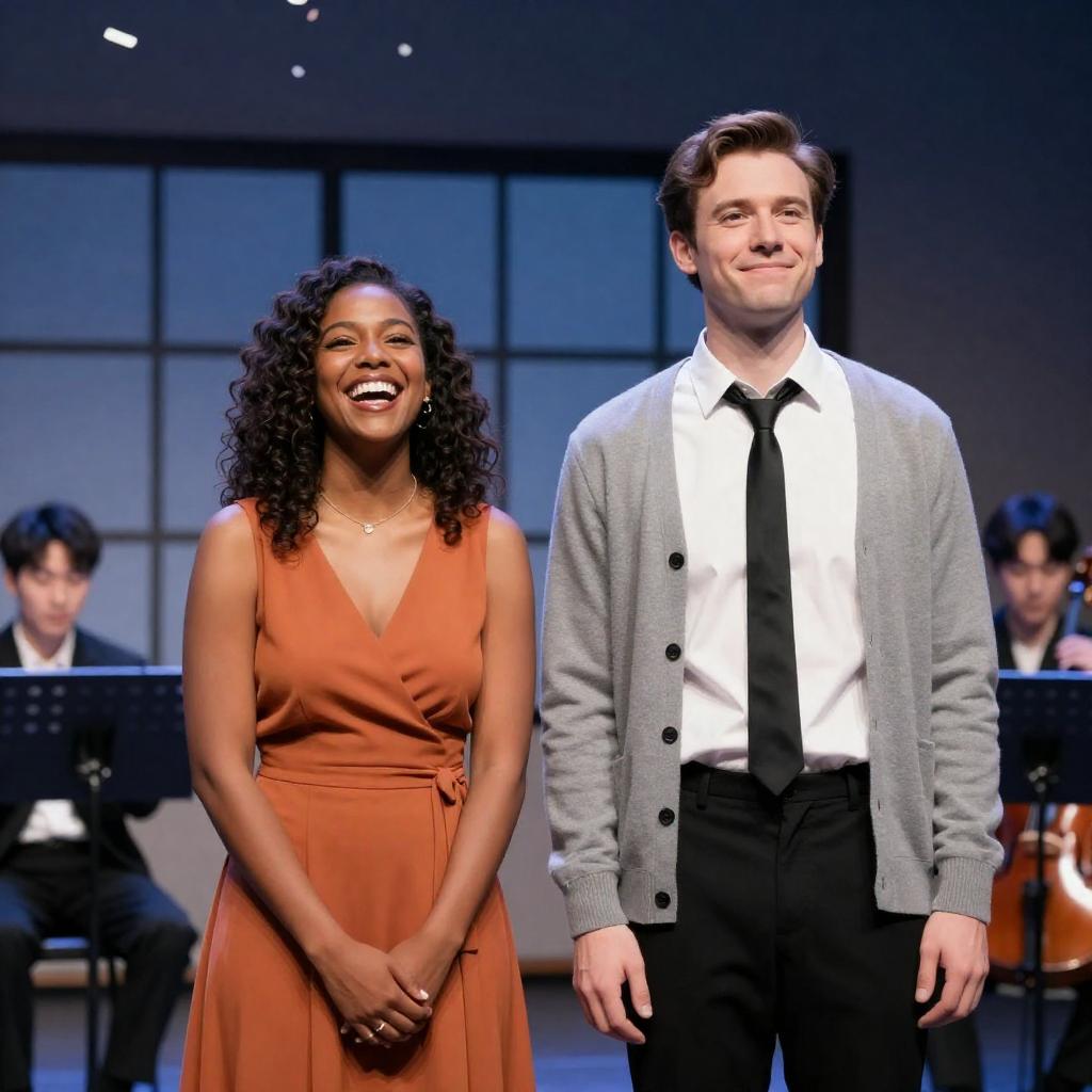 Photograph of two actors on stage. Woman with dark curly hair, medium brown skin, wearing orange dress, laughing. Man with short brown hair, light skin, wearing white shirt, gray cardigan, black tie, smiling. Background with window, music stands, and two musicians. Confetti falling from ceiling. Woman's hands clasped in front. Both standing side by side. Musicians in background playing instruments.