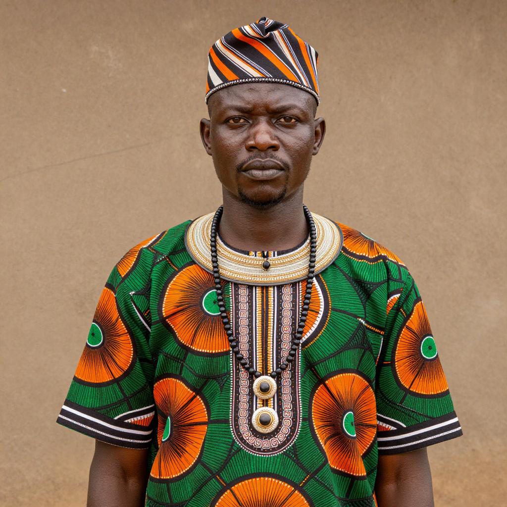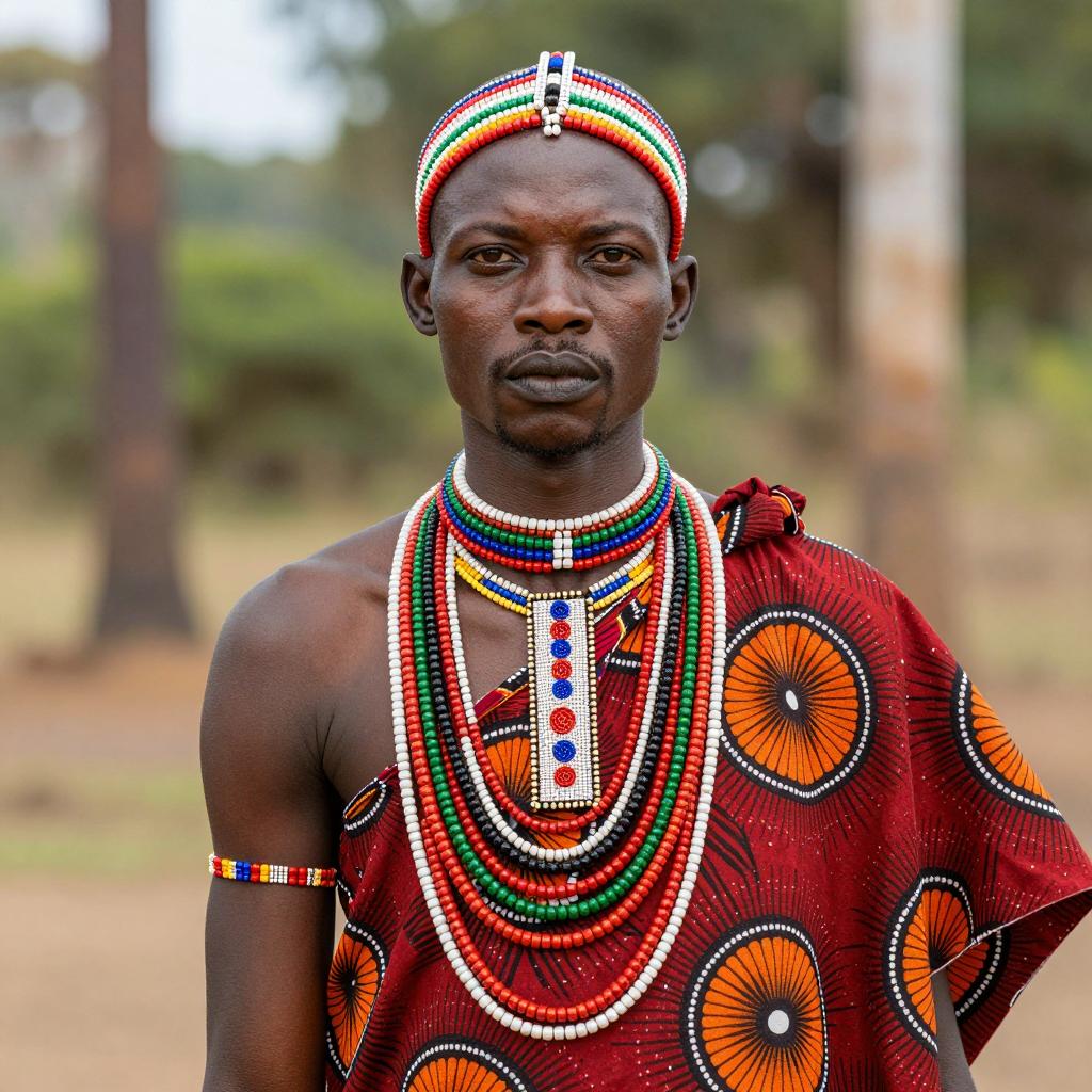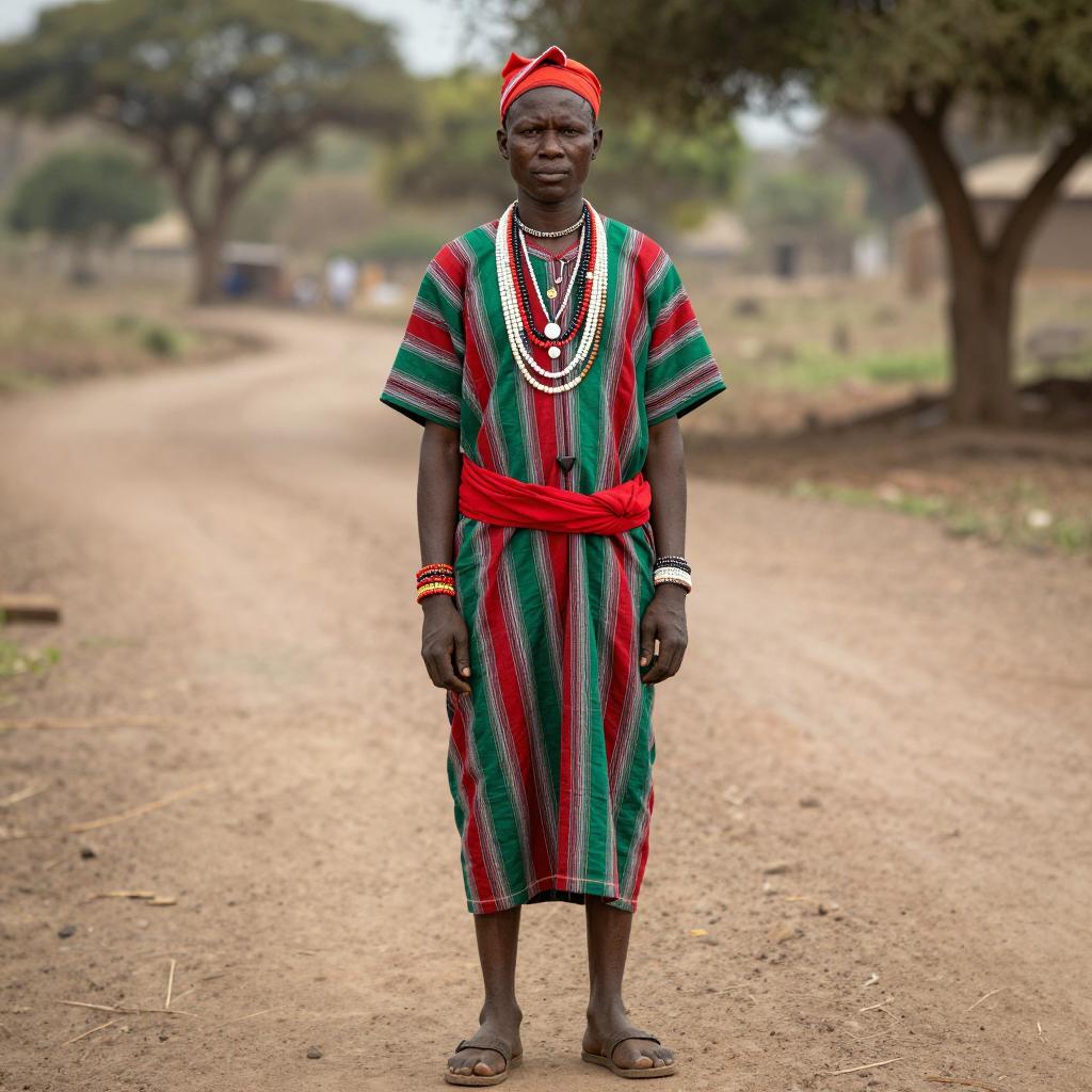 Man santali traditional, photograph of an African man, standing outdoors on a dirt path, wearing traditional clothing, green and red striped shirt, red sash, multiple layered beaded necklaces, red headwrap, serious expression, blurry forest background, natural light, realistic style, detailed ures, ethnic attire, full body, front view, centered composition