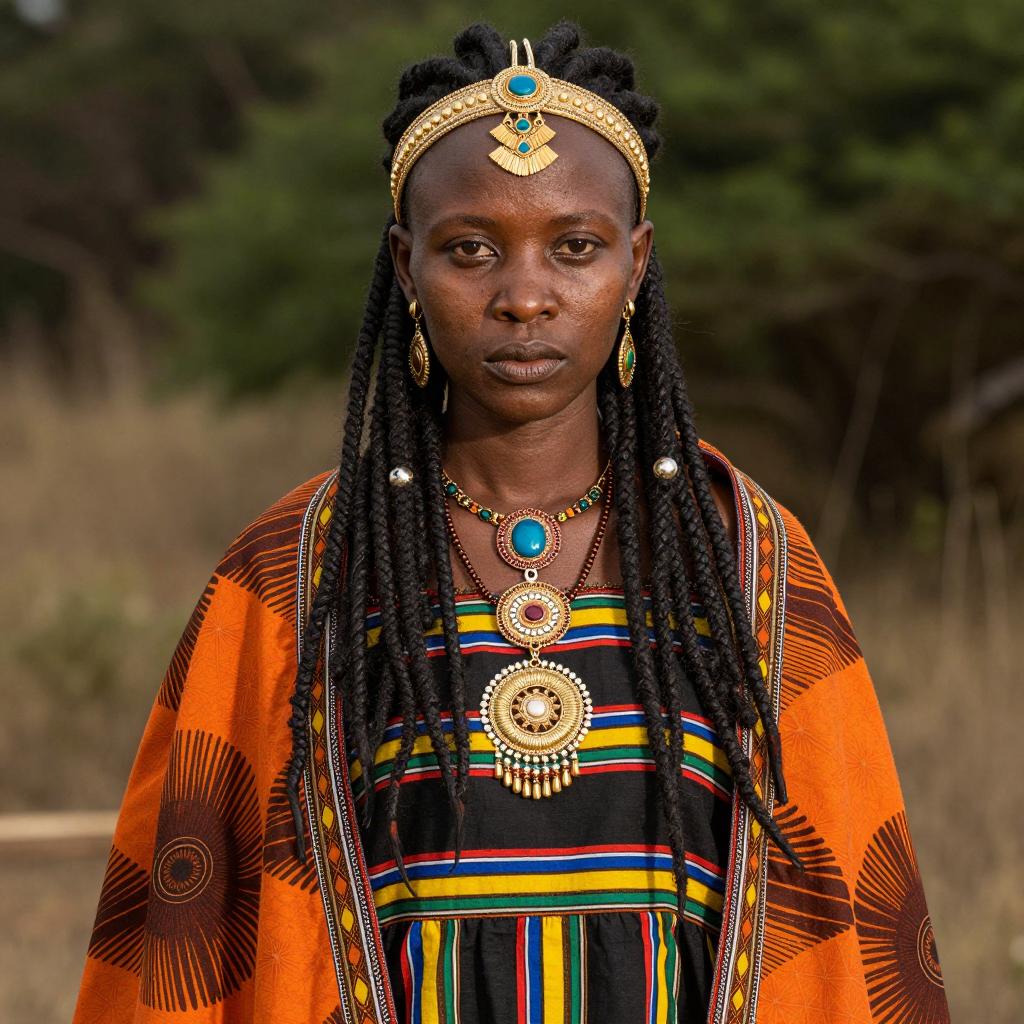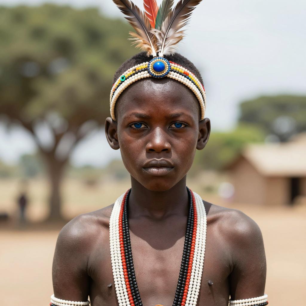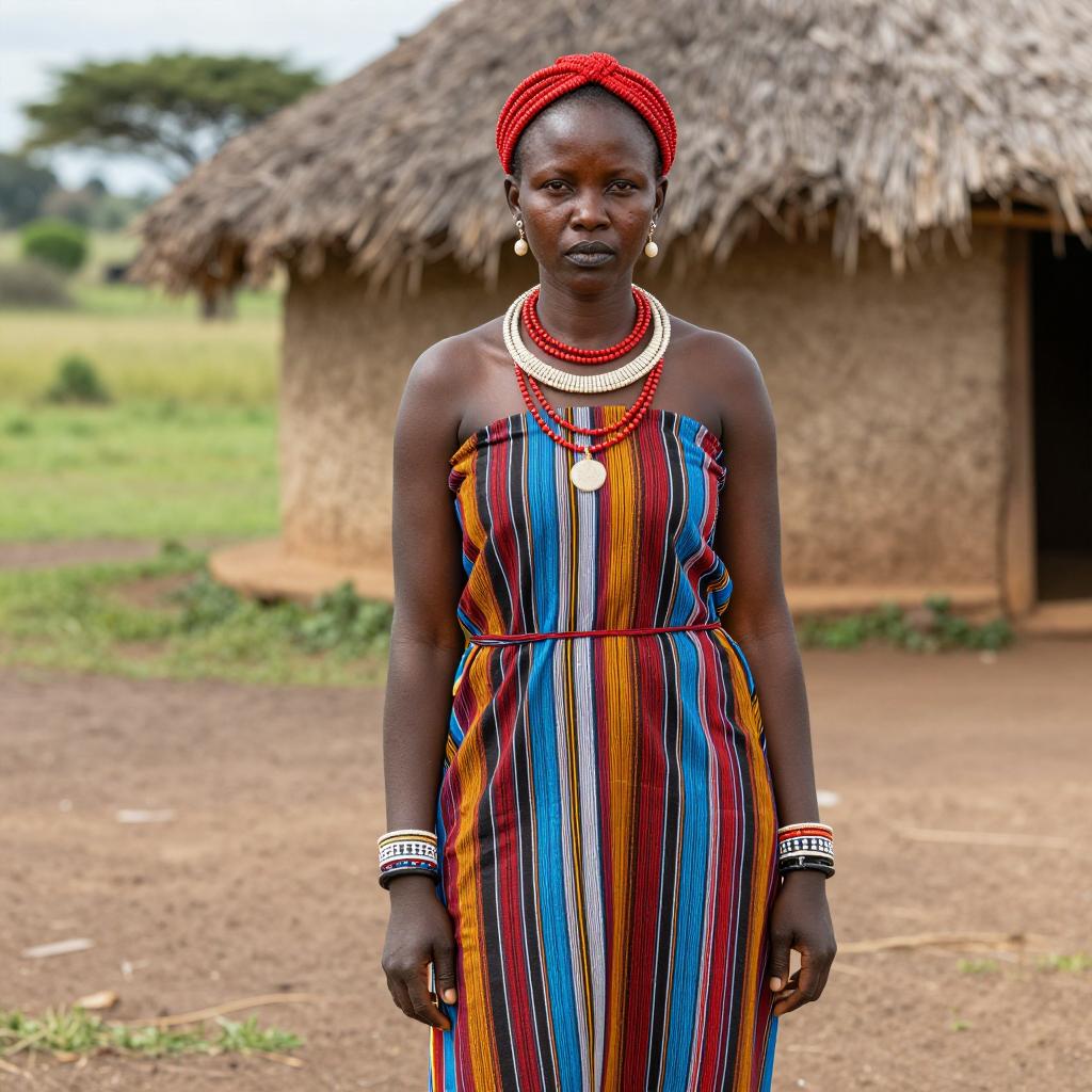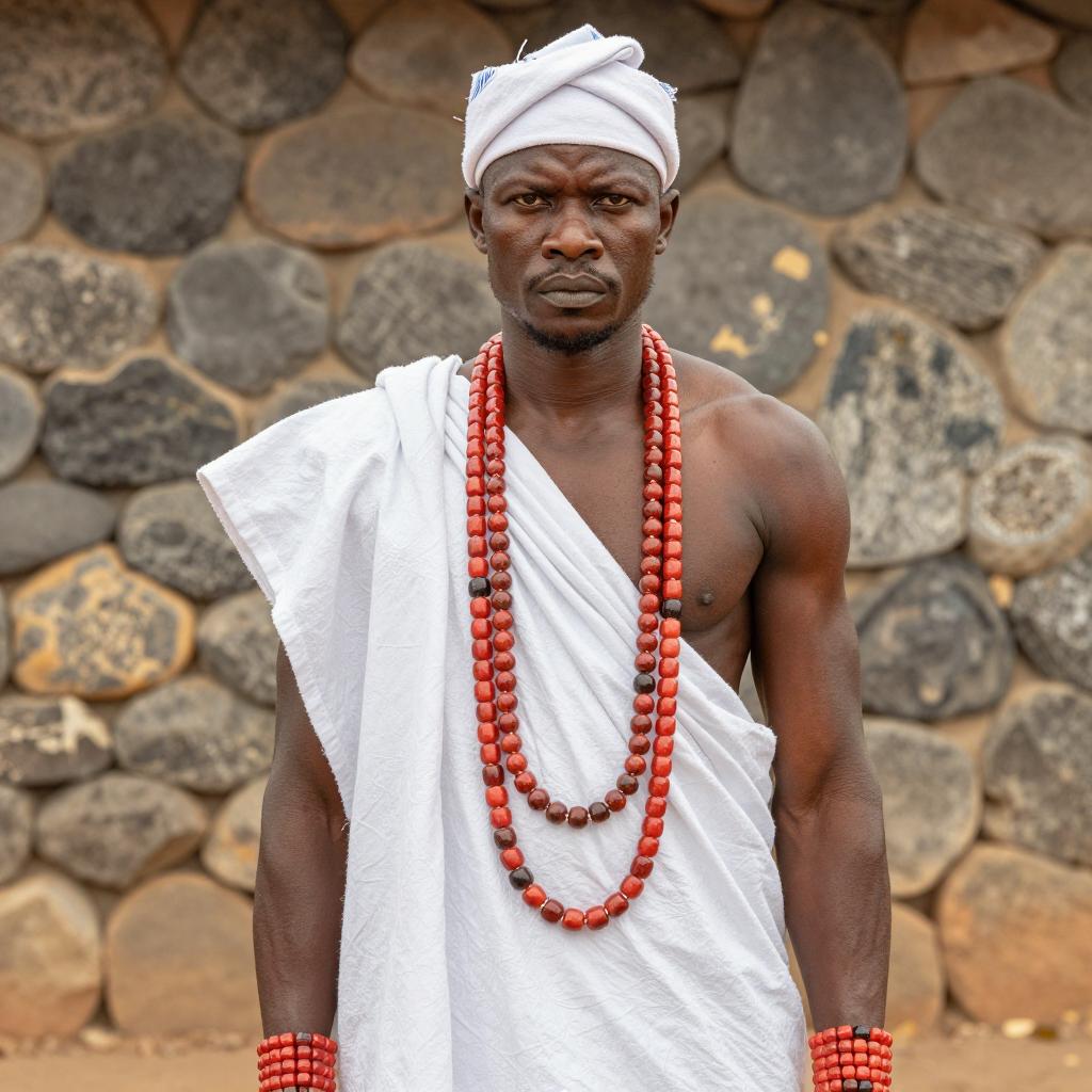 Man santali traditional, photograph of an African man, standing outdoors on a dirt path, wearing traditional clothing, green and red striped shirt, red sash, multiple layered beaded necklaces, red headwrap, serious expression, blurry forest background, natural light, realistic style, detailed ures, ethnic attire, full body, front view, centered composition