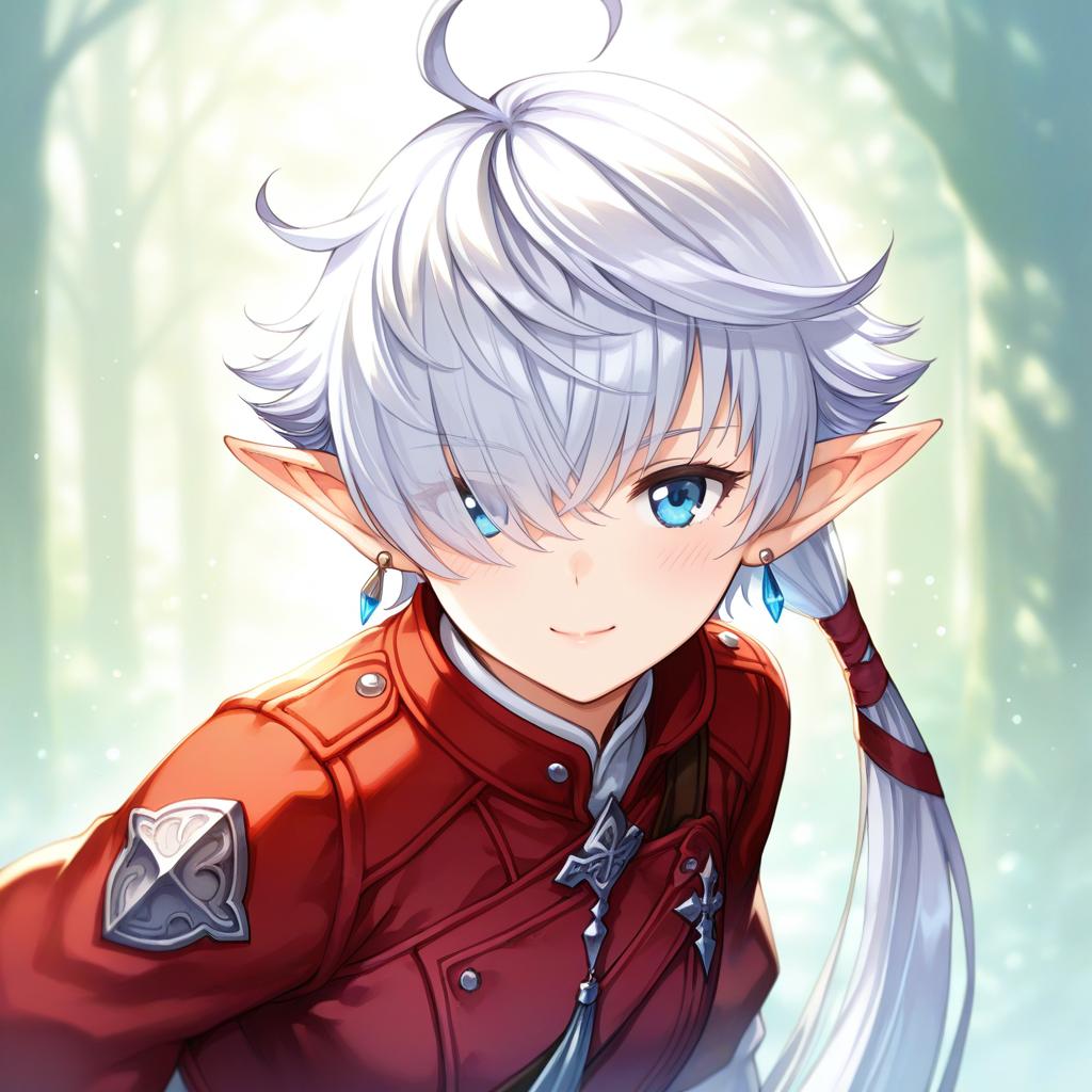 Digital art of a fantasy elf girl characterized by long white hair tied in a ponytail with a ribbon, bright blue eyes, and an ahoge hairstyle element. She is dressed in a detailed red jacket with silver emblem accents and wears blue crystal earrings. The background features a soft, ethereal forest light, enhancing the mystical atmosphere. The character appears inspired by Elezen race from Final Fantasy series.