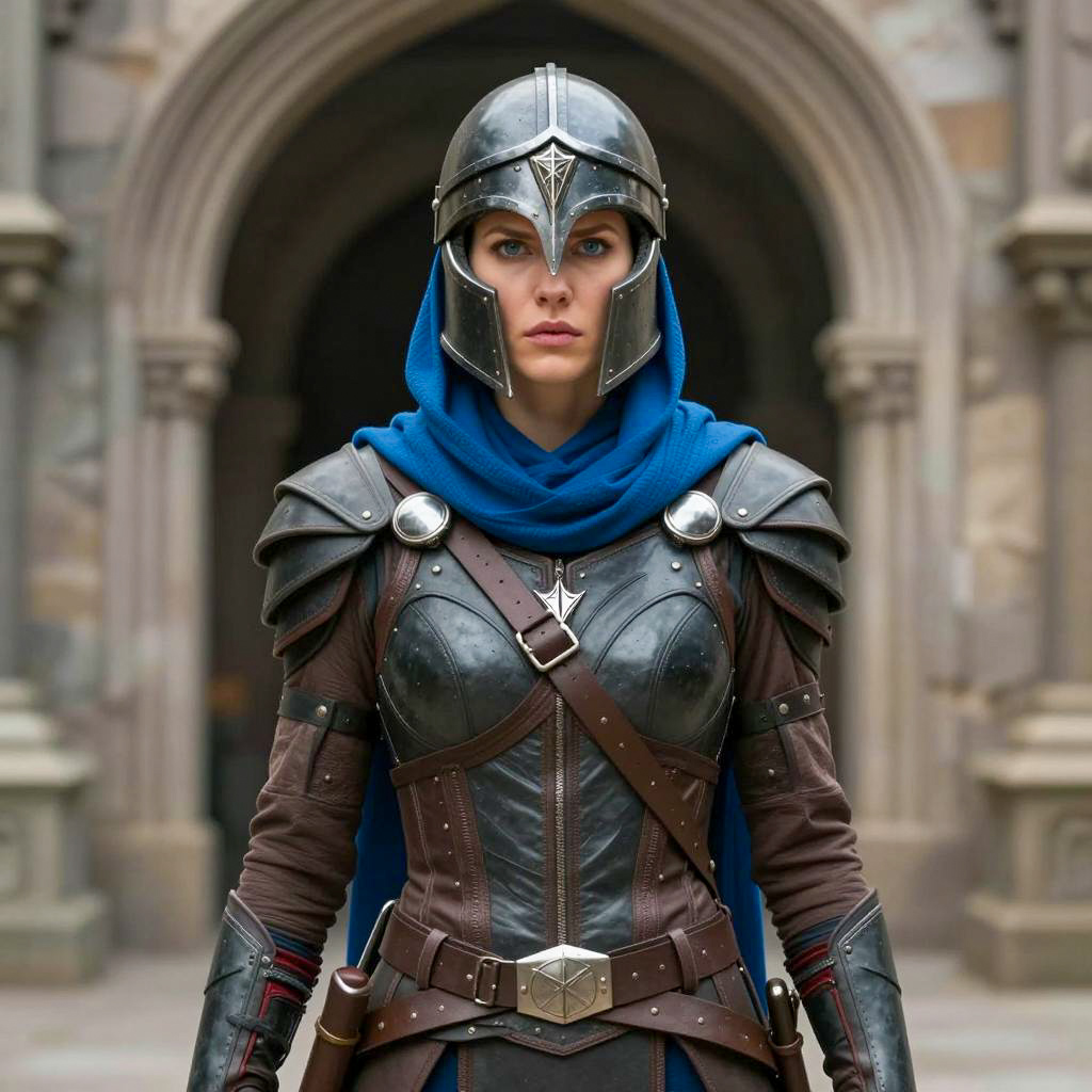 Sci costume woman, photorealistic, female, soldier, dark leather armor, black tactical pants, brown belt, high collar, brown hair in bun, serious expression, holding gun in right hand, sunlight, stone wall background, outdoors, daytime, detailed ures, realistic lighting, front view, standing, cinematic style, sci-fi elements, digital artwork