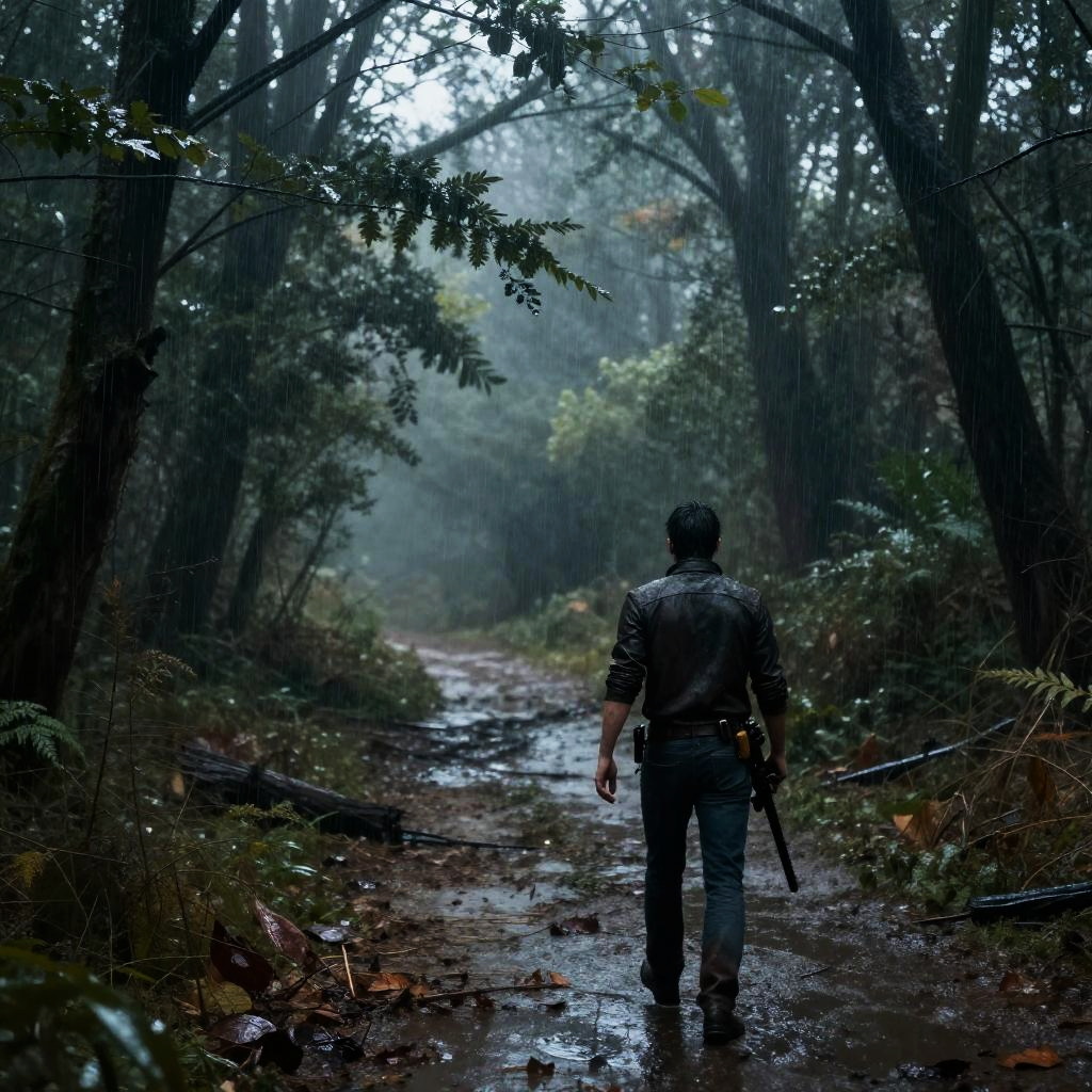 Resident Evil 4 Remake rain pouring over desolate forest path, wet foliage glistening, mist swirling, suspenseful mood with subtle horror elements, cinematic lighting