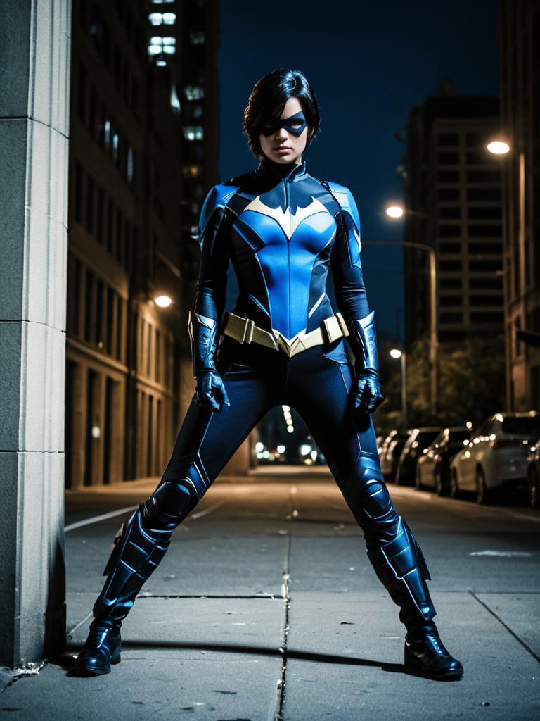 Woman in Nightwing costume, full-body superhero cosplay photo in urban backdrop