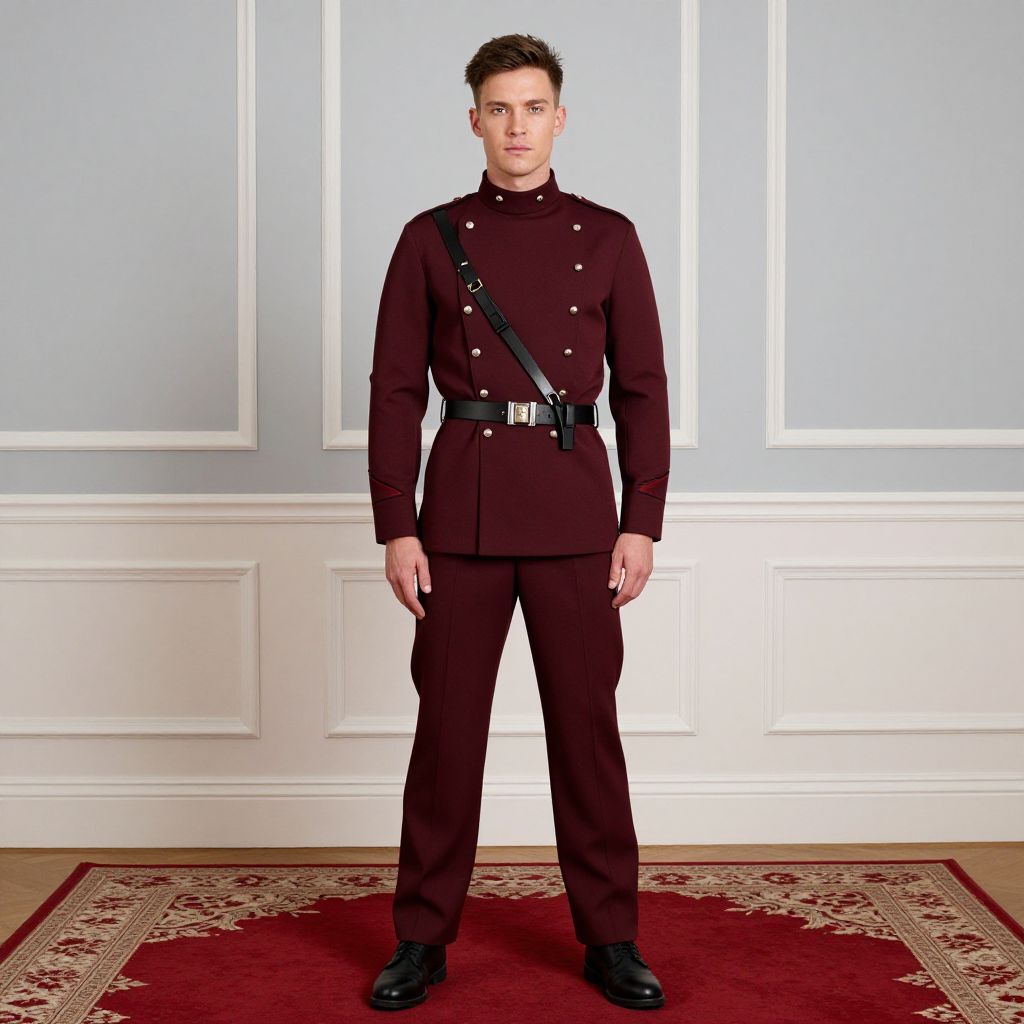 Photograph of a young Caucasian man standing in a formal, well-lit room with white wainscoting and a light blue wall. He has short, dark brown hair and a serious expression. He wears a dark maroon military-style uniform with a black belt, black leather strap across the chest, double-breasted buttons, and black shoes. His hands rest by his sides. The floor is covered with a red and gold patterned rug. The image has a formal, staged appearance with even lighting and a clean, minimalist background.