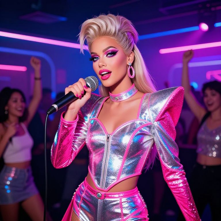 Glam rock Barbie in a futuristic nightclub setting, dressed in shimmering silver and hot pink outfit with exaggerated shoulder pads, holding a microphone, glittery eye makeup, vibrant colorful LED lights reflecting off shiny surfaces, energetic crowd dancing, dynamic and edgy mood.