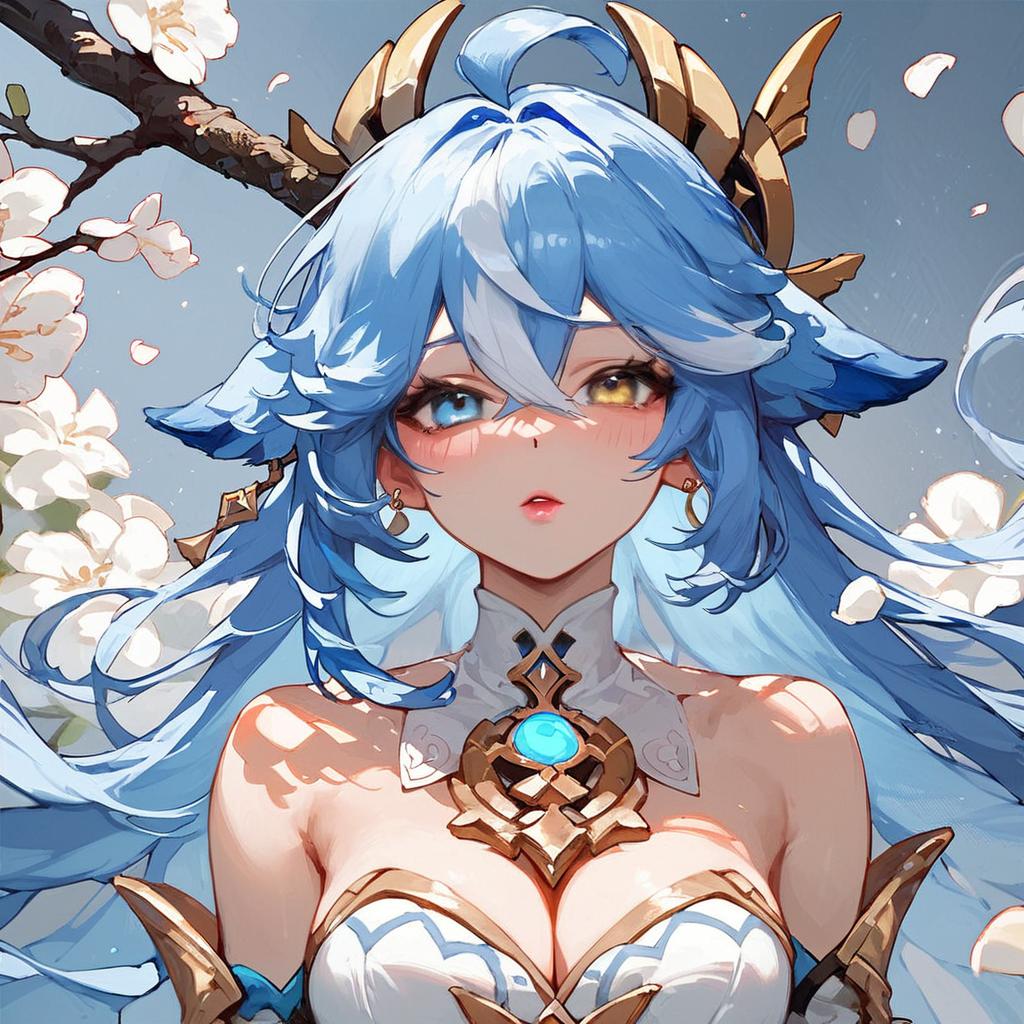 Score_9, score_8_up, score_7_up, source_anime, ganyu, blue hair, goat horns, horns, long hair, purple eyes, sidelocks, smile, gloves, bare shoulders, detached sleeves, black gloves, bell, bodysuit, neck bell, black bodysuit, vision \(genshin impact\), bodystocking, cowbell, chinese knot, outdoors, forest, nature, looking at viewer, cowboy shot, dutch angle, dynamic pose