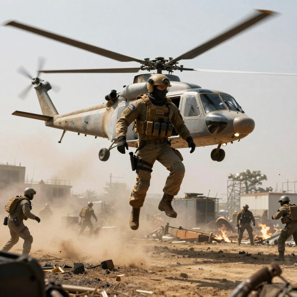 Random siege operator jumping from a helicopter into a chaotic battleground, full-body tactical outfit with patches, dynamic mid-air pose, panoramic background of a war zone, dust clouds and flare effects, cinematic color grading