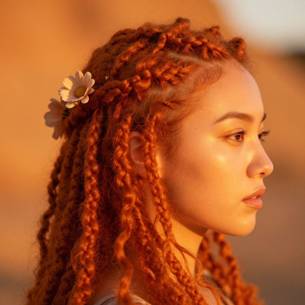 Close-up of ginger orange soft locs styled elegantly with floral accents, glowing skin reflecting golden hour light, intricate loc patterns, soft bokeh background with warm orange hues blending seamlessly, capturing a natural and ethereal beauty.