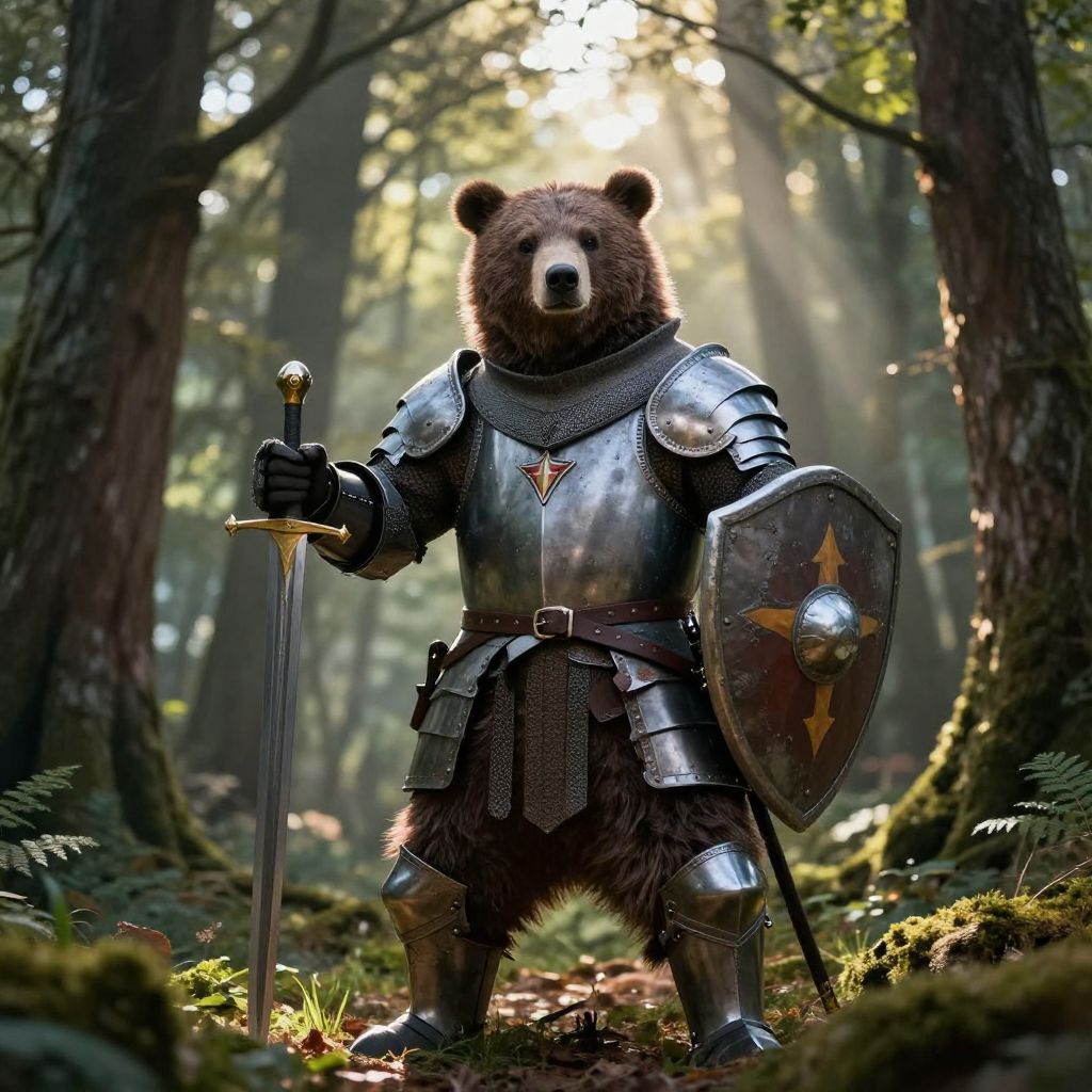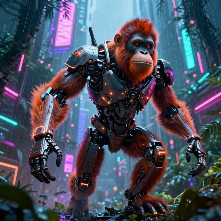 Putin on a bear, cyberpunk city backdrop, neon lights reflecting on snowy streets, futuristic warrior look, intense gaze, detailed mechanical bear armor, high contrast