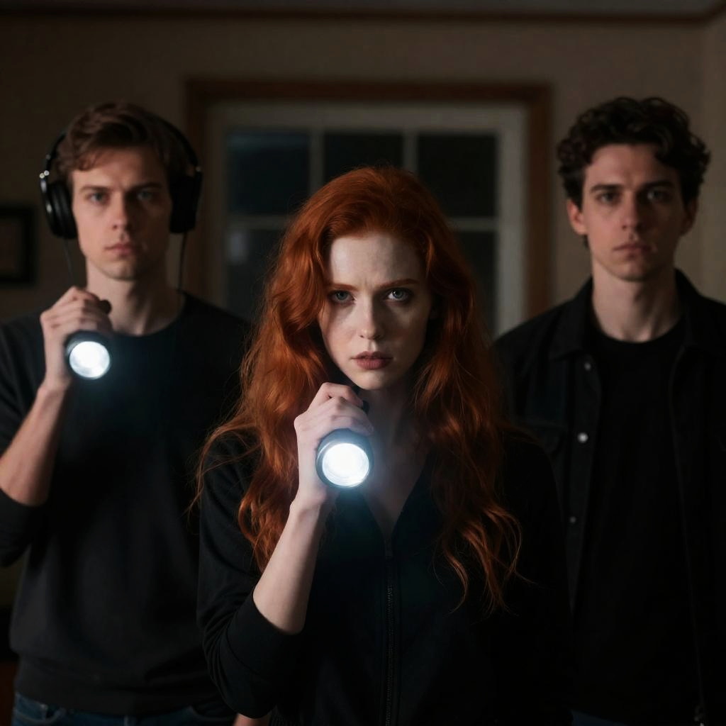 Photograph of three people in a dimly lit room. Central red-haired woman with pale skin, intense expression, holding flashlight close to face. Man on left with brown hair, headphones, holding flashlight in right hand. Man on right with dark hair, neutral expression. All wear dark clothing. Background includes darkened window and wooden walls.
