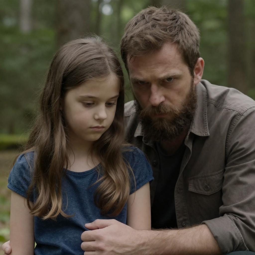 Photograph of a bearded man with brown hair, intense gaze, embracing a person with curly hair from behind. Both wear patterned jackets, set in a green, forested background. Man's left hand on the other's back, right hand on their shoulder. Bright, natural light.