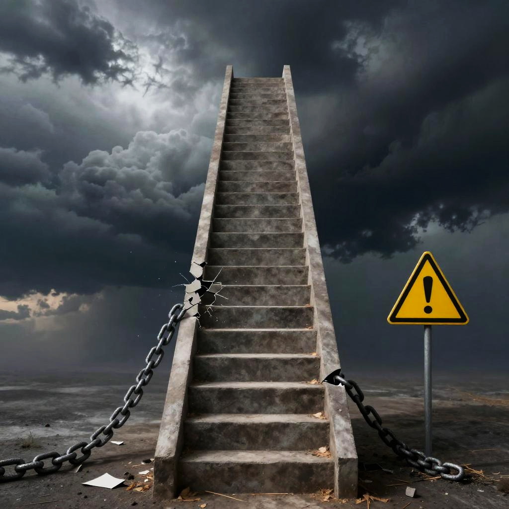 Eskalationsstufen illustrated as a conceptual staircase or ladder ascending into stormy skies, each step representing heightened conflict stages, surreal lighting with sharp contrasts and symbolic elements like broken chains and warning signs, cinematic atmosphere.