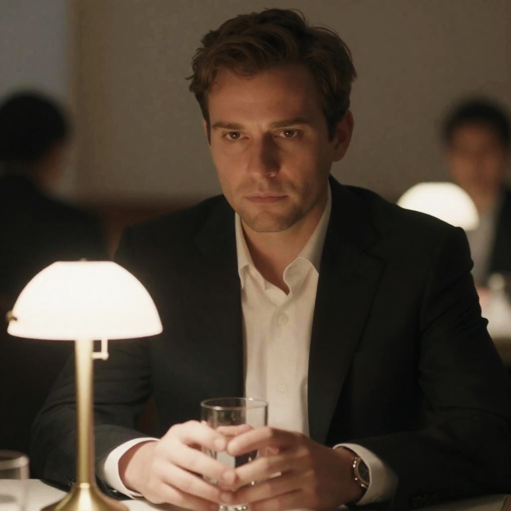 Portrait of a young light-skinned man with short brown hair, wearing a white shirt and black vest, standing behind a metal grid covered in mathematical equations written in white chalk. The man has a serious expression and is looking upward, with his face partially visible through the grid.