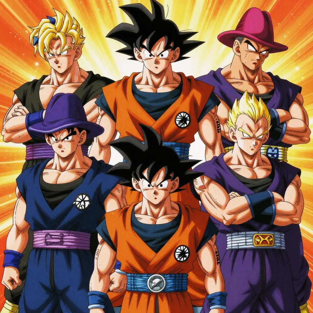 The cartel and Dragon Ball fusion featuring iconic Dragon Ball characters styled as cartel leaders, rich detailed costumes, intense expressions in a stylized anime art style.