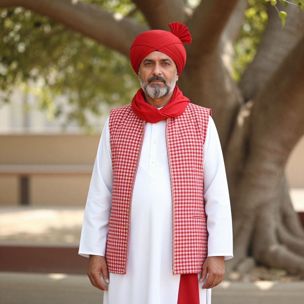 A middle-aged man with a dignified demeanor, wearing a traditional turban tied securely at the top of his head, dressed in a vibrant red and white outfit that includes a long white shirt, red trousers, and a red and white checked waistcoat. He has a neatly trimmed beard and a calm, wise expression. A bright red scarf is wrapped around his neck, adding a striking contrast to his outfit. He stands confidently in a serene outdoor setting, possibly under a traditional banyan tree, with soft sunlight filtering through the leaves, capturing a sense of cultural heritage and quiet strength.