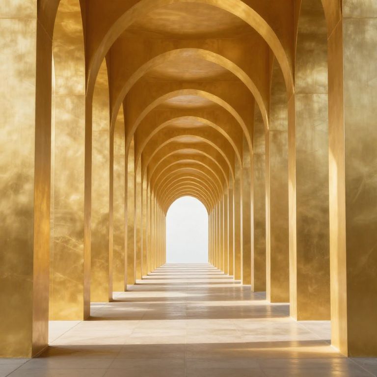 Golden, archway corridor with symmetrical, repeating arches leading to a bright, sunlit exit. Photorealistic digital artwork emphasizing light and perspective