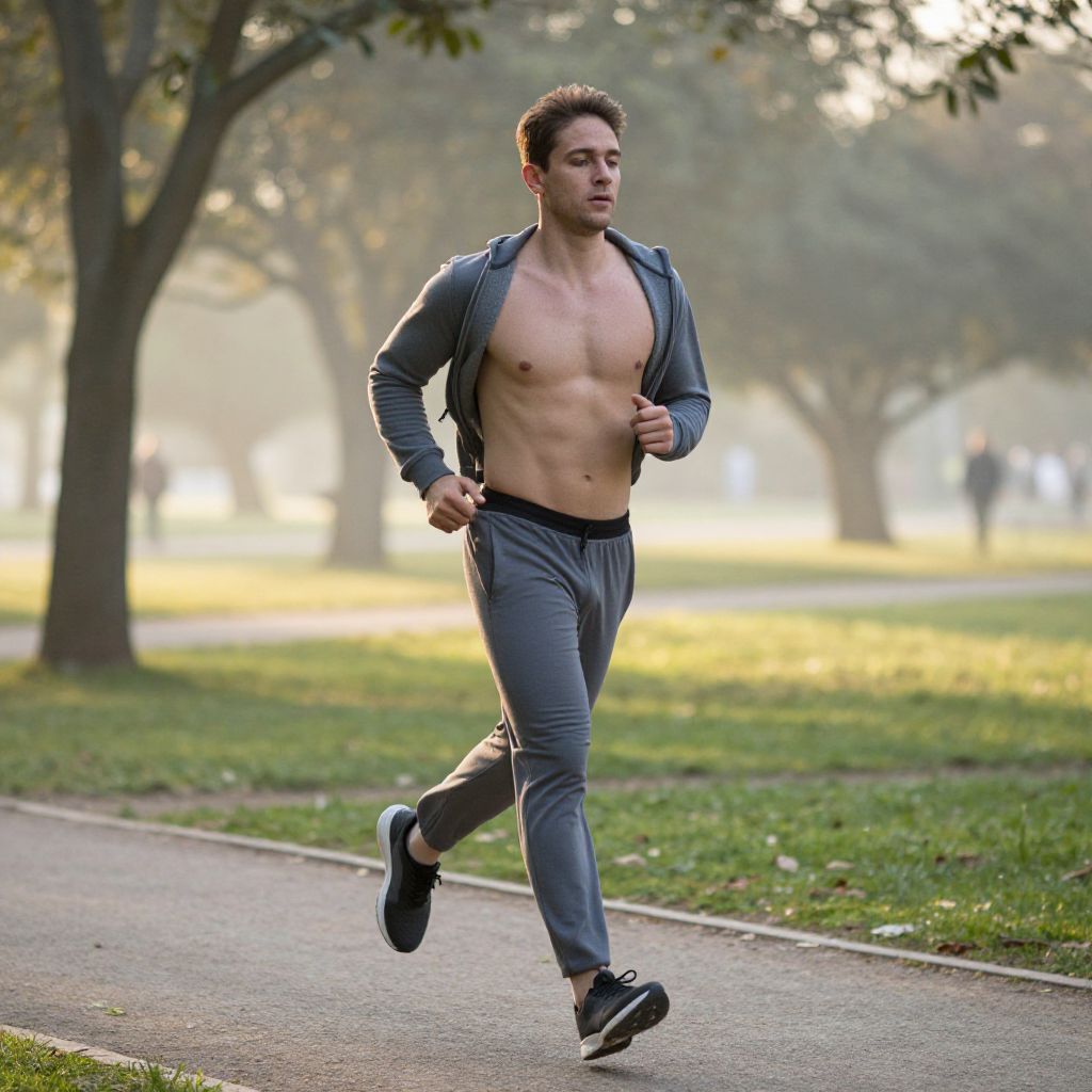 Six pack photo prompt: A natural outdoor sunrise scene featuring a man jogging through a park, slightly exposed mid-activity with a visible six-pack under soft morning light, wearing lightweight fabric pants and a hoodie, capturing the blend of movement, fitness, and natural beauty in a realistic, lifestyle-focused image.