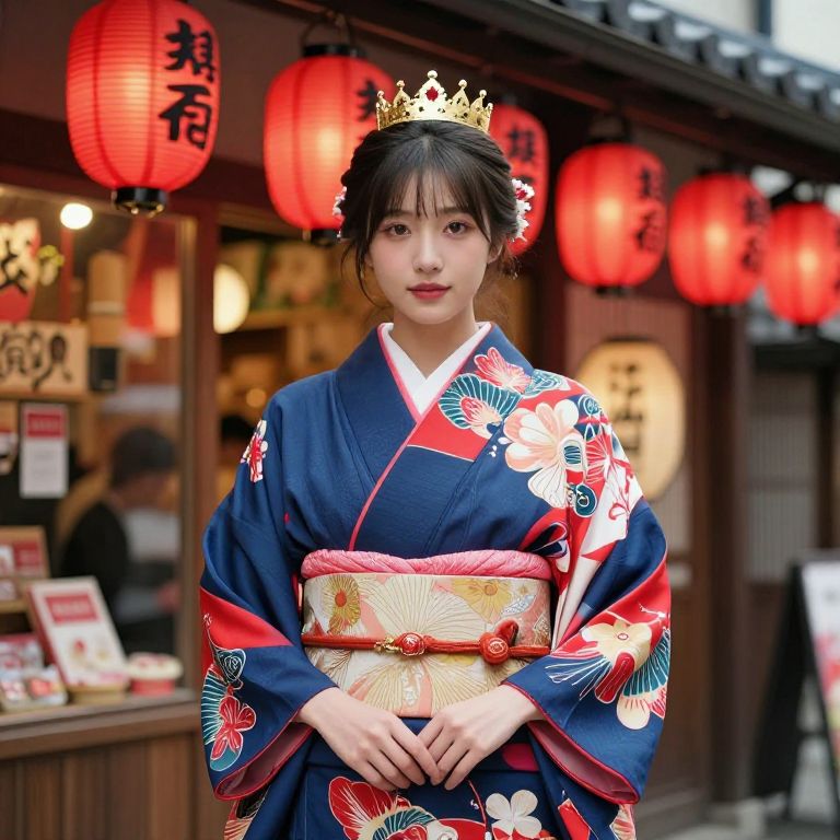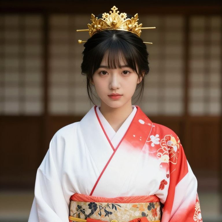 Asian girl wearing a red and white kimono with a golden crown on her head.